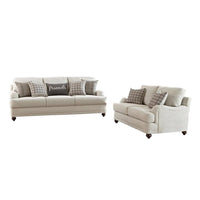 Made for a modern farmhouse living room, this elegant sofa and loveseat feature tailored English saddle style arms and T-shaped cushions. Wrapped in a light gray linen-like fabric, this set lends a charming, country quality to a space. Resting on dark brown turned legs, each piece offers a homely elegance. Included with each are accent pillows in a plaid and houndstooth patterns. Place this set in a room to create a traditional-inspired design aesthetic.