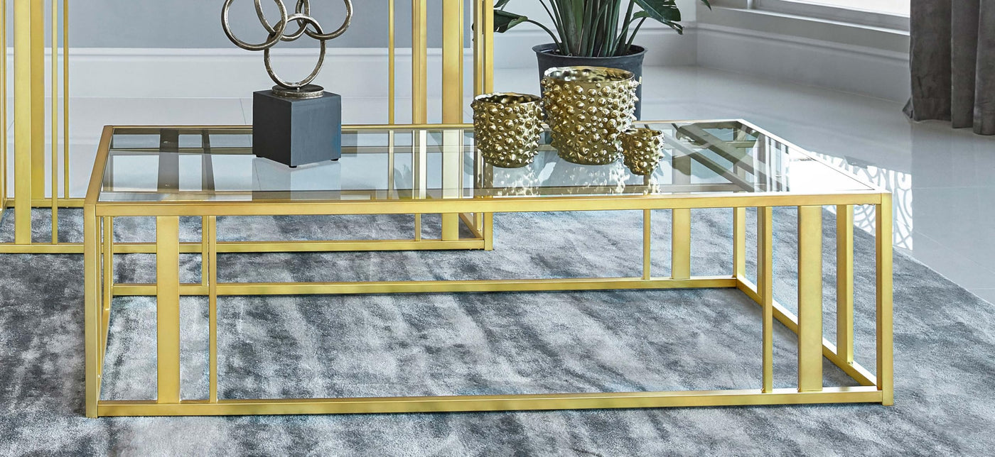 Create a well-styled living room that brims with modern appeal. This contemporary coffee table flaunts a unique design that stands out in any space. The base is beautifully crafted with crisp, clean lines of electroplated metal. A magnificent, matte brass finish adds an edge of elegant allure. The rectangular tabletop is made of clear tempered glass for exceptional quality and style.