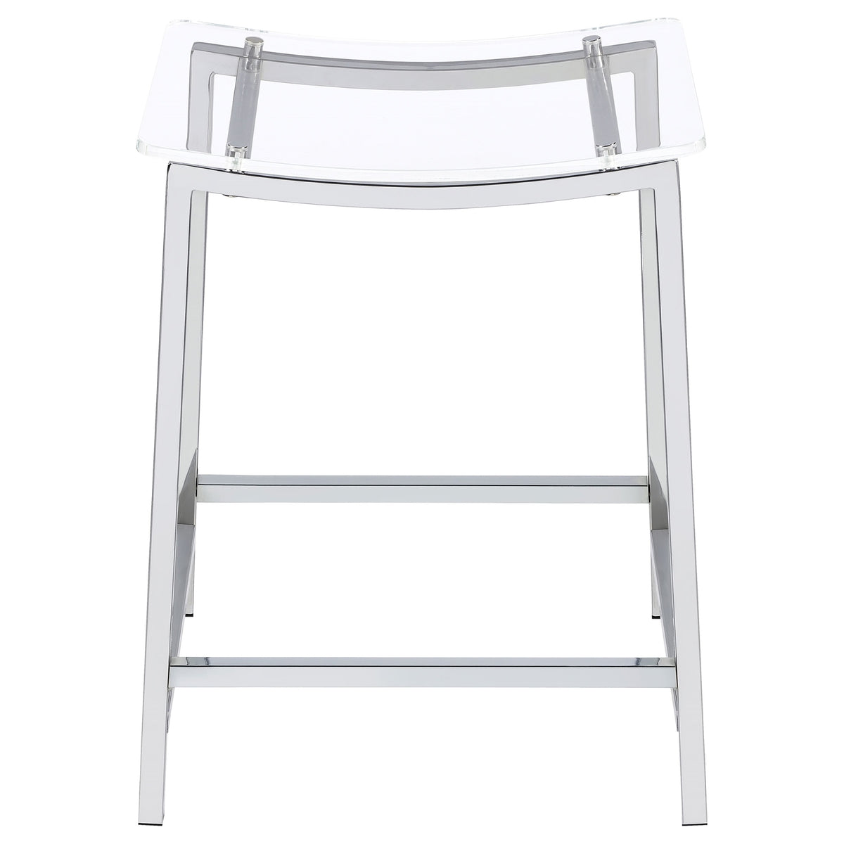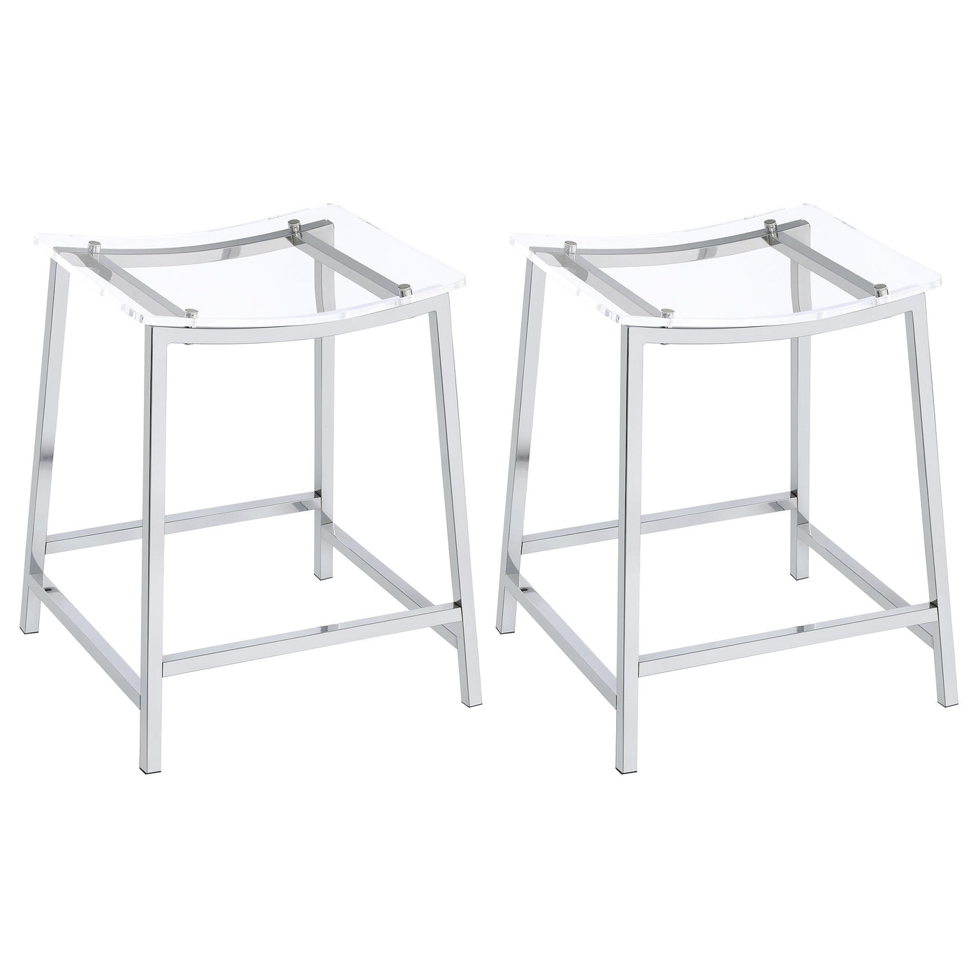 Pull up a stool and enjoy a casual modern entertaining experience from the privacy of your home. This set of two counter-height stools reflects ultra-contemporary design standards using crisp modern materials. Gleaming chrome finish metal framing includes a two-bar seat support and built-in footrests. A gently curved seat made of acrylic reveals the nuts and bolts of metal framing. Add this stool set to a sleek kitchen island or lounge space.FeaturesEnjoy a casual modern entertaining experience in your home Set of two counter-height stools with ultra-contemporary design Gleaming chrome finish with two-bar seat support and built-in footrests Gently curved acrylic seat reveals intricate metal framing details Ideal addition for sleek kitchen islands or lounge spacesDimensions:Counter StoolAssembled Product: 18 inches wide x 16 inches deep x 24 inches high Seat Width: 16.75 inches Seat Depth: 13.25 inches Seat Height: 24 inches Weight Capacity: 300 poundsAt Coaster, we are your premier source for exquisite furniture, offering diverse styles to enhance every aspect of your life. Our passion for excellence drives us to innovate, crafting budget-friendly furniture that complements your lifestyle. Explore our brands for endless design inspiration and make your living experience exceptional with thoughtfully designed, affordable pieces that inspire a life well-lived.