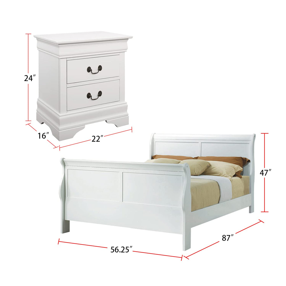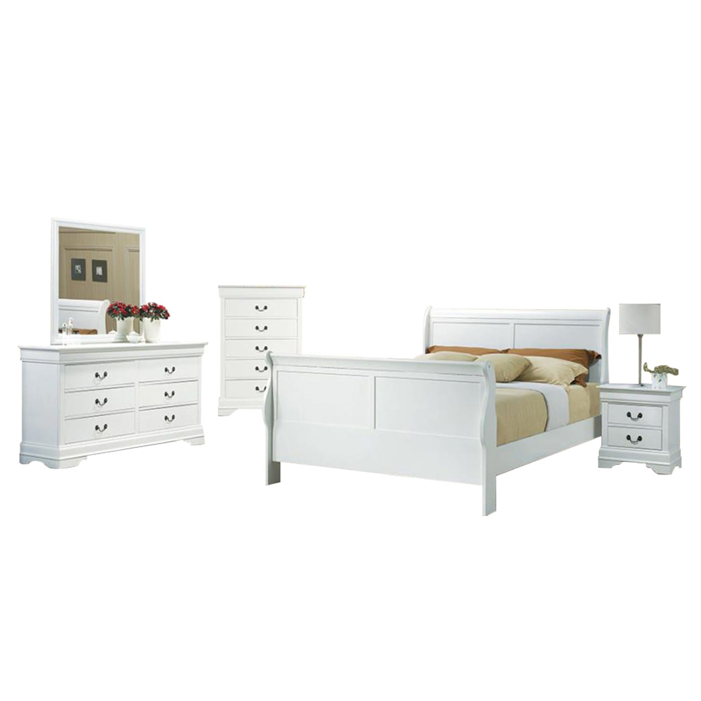 This gorgeous five-piece bedroom set exudes cool, classic glamour. Available in full, queen, or twin sizes, it instantly updates a guest or child's bedroom with sleek style and exceptional versatility. A clean, white finish combines with tasteful wood beveling to form a chic, sophisticated design. A classic Louis Philippe style bed creates an elegant focal point to pleasingly enhance your space. Complete with an array of spacious drawers, this durable set offers maximum storage space.FeaturesTraditional elegance radiates from a white finish and gentle curves that create a soothing look and feel Classic Louis Philippe style bed is distinguished by its slightly higher headboard Antique brass finish bail drawer pulls add contrast Kenlin glides and French dovetailing create a sturdy drawer foundationDimensions:Full Bed Assembled Product: 56.25 inches wide x 87 inches deep x 47 inches high Weight Capacity: 600 poundsNightstand Assembled Product: 22 inches wide x 16 inches deep x 24.25 inches highDresser Assembled Product: 61 inches wide x 18 inches deep x 34.25 inches highDresser Mirror Assembled Product: 38.25 inches wide x 1 inches deep x 38.25 inches highChest Assembled Product: 33 inches wide x 18 inches deep x 48.25 inches highAt Coaster, we are your premier source for exquisite furniture, offering diverse styles to enhance every aspect of your life. Our passion for excellence drives us to innovate, crafting budget-friendly furniture that complements your lifestyle. Explore our brands for endless design inspiration and make your living experience exceptional with thoughtfully designed, affordable pieces that inspire a life well-lived.