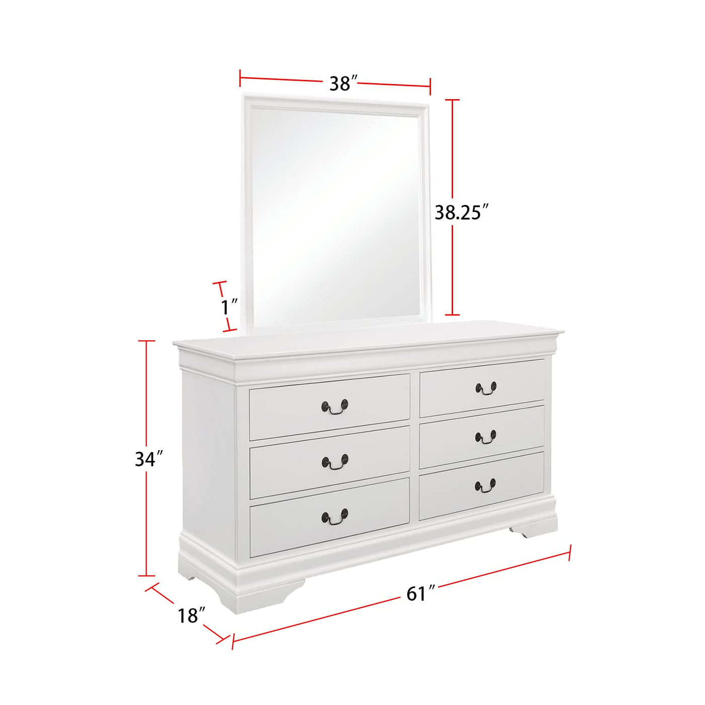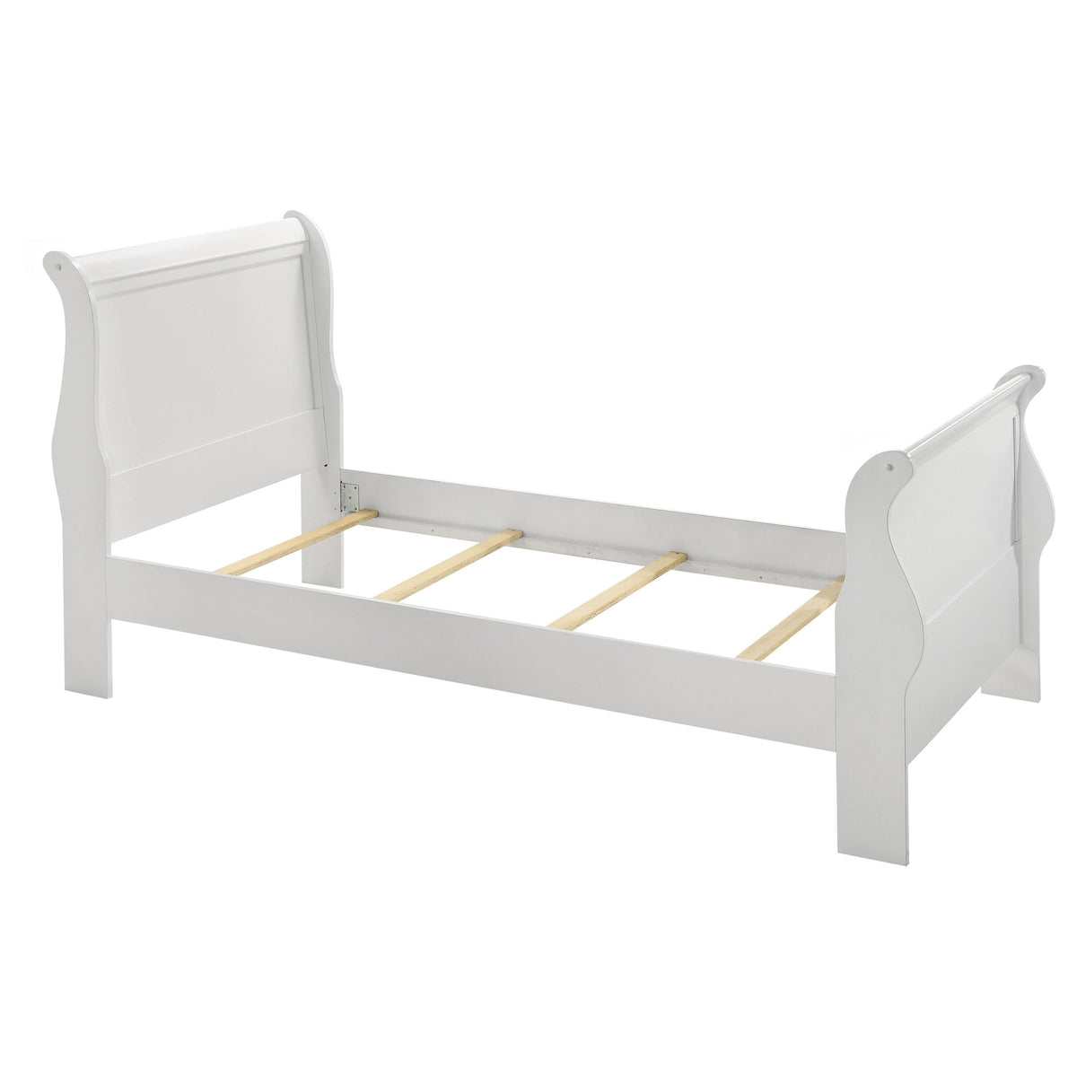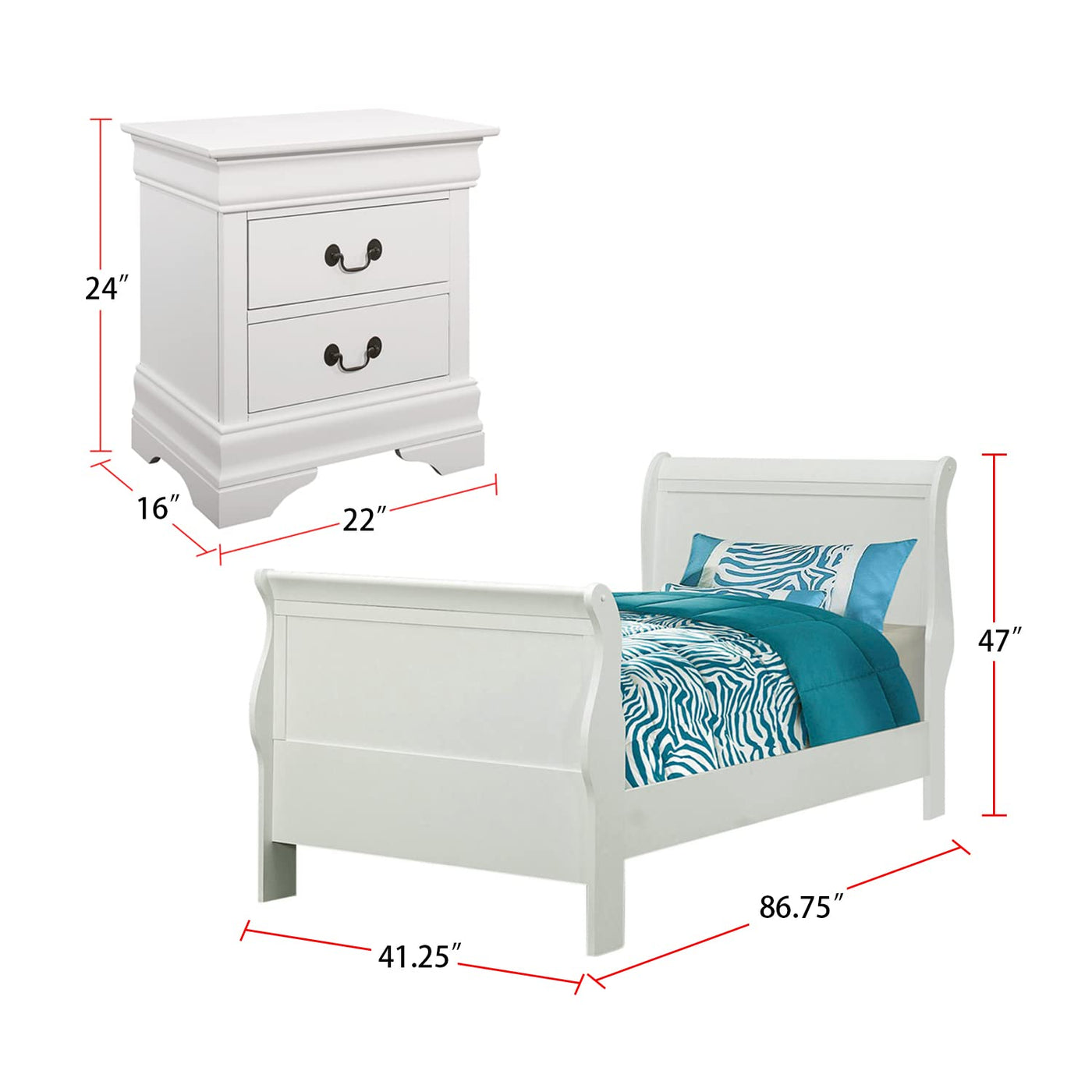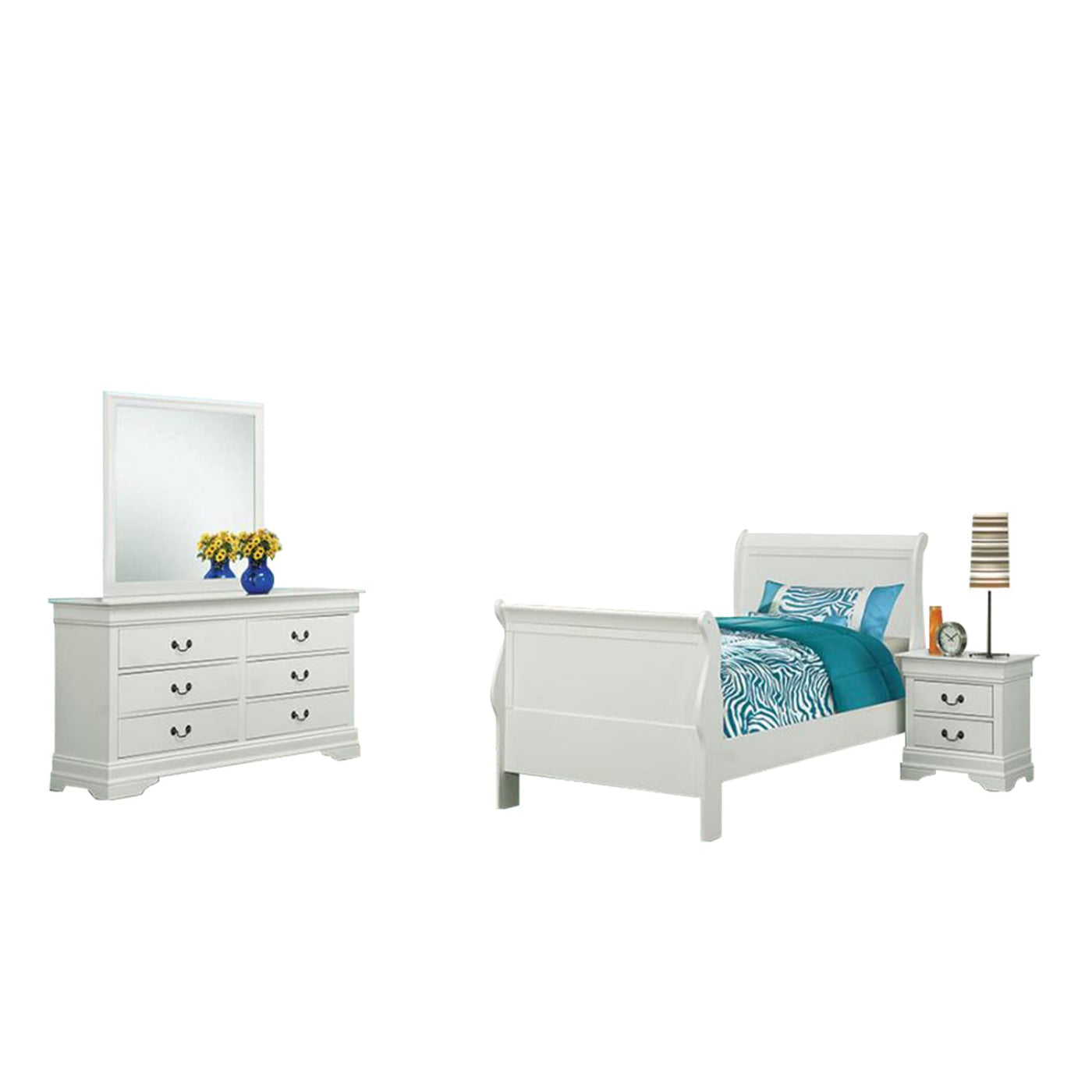 With a clean, classic design, this four-piece bedroom set is a stylish addition to any home. Complete with a bed, dresser, mirror, and nightstand, each piece is expertly crafted with graceful lines and elegant wood beveling. A soft, white finish lends a touch of modern glamour to its sophisticated design. Its drawers are constructed with Kenlin glides and French dovetailing for added sturdiness and durability. Offered with your choice of a queen, full, or twin size bed, this stunning set is ideal for a guest bedroom.FeaturesTraditional elegance radiates from a white finish and gentle curves that create a soothing look and feel Classic Louis Philippe style bed is distinguished by its slightly higher headboard Antique brass finish bail drawer pulls add contrast Kenlin glides and French dovetailing create a sturdy drawer foundationDimensions:Twin Bed Assembled Product: 41.25 inches wide x 87 inches deep x 47 inches high Weight Capacity: 400 poundsNightstand Assembled Product: 22 inches wide x 16 inches deep x 24.25 inches highDresser Assembled Product: 61 inches wide x 18 inches deep x 34.25 inches highDresser Mirror Assembled Product: 38.25 inches wide x 1 inches deep x 38.25 inches highAt Coaster, we are your premier source for exquisite furniture, offering diverse styles to enhance every aspect of your life. Our passion for excellence drives us to innovate, crafting budget-friendly furniture that complements your lifestyle. Explore our brands for endless design inspiration and make your living experience exceptional with thoughtfully designed, affordable pieces that inspire a life well-lived.