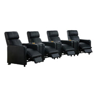 Modern home theater seats are bound to bring the movie experience to your home. Choose your custom configuration of black home theater seats, upholstered in leatherette. Slim track armrests give the chairs stylish appeal along with tufted backrests. Consider the optional consoles to go between each seat and serve as a cup holder. Choose this home theater recliner set to elevate your next home theater adventure.FeaturesHome theater collection upholstered in black polyurethane Pair multiple recliners as needed Console wedges feature two (2) cup holders with removable stainless steel inserts and adds versatility to seating profiles 1" 3.0lbs cool gel memory foam topperDimensions:Push Back Recliner Assembled Product: 29.5 inches wide x 33.75 inches deep x 41.25 inches high Weight Capacity: 300 poundsWedge Console Assembled Product: 11.5 inches wide x 7.75 inches deep x 24.25 inches highAt Coaster, we are your premier source for exquisite furniture, offering diverse styles to enhance every aspect of your life. Our passion for excellence drives us to innovate, crafting budget-friendly furniture that complements your lifestyle. Explore our brands for endless design inspiration and make your living experience exceptional with thoughtfully designed, affordable pieces that inspire a life well-lived.