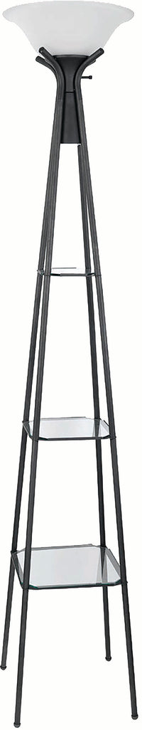 A combination piece, this lamp and shelving unit is a unique way to store your accent pieces. Featuring three glass shelves for storage, upward and downward facing lights, and a frosted glass shade, this lamp has all kinds of interesting features! This tall floor lamp is perfect for those in search of a lighting fixture that combines high style with unique function.