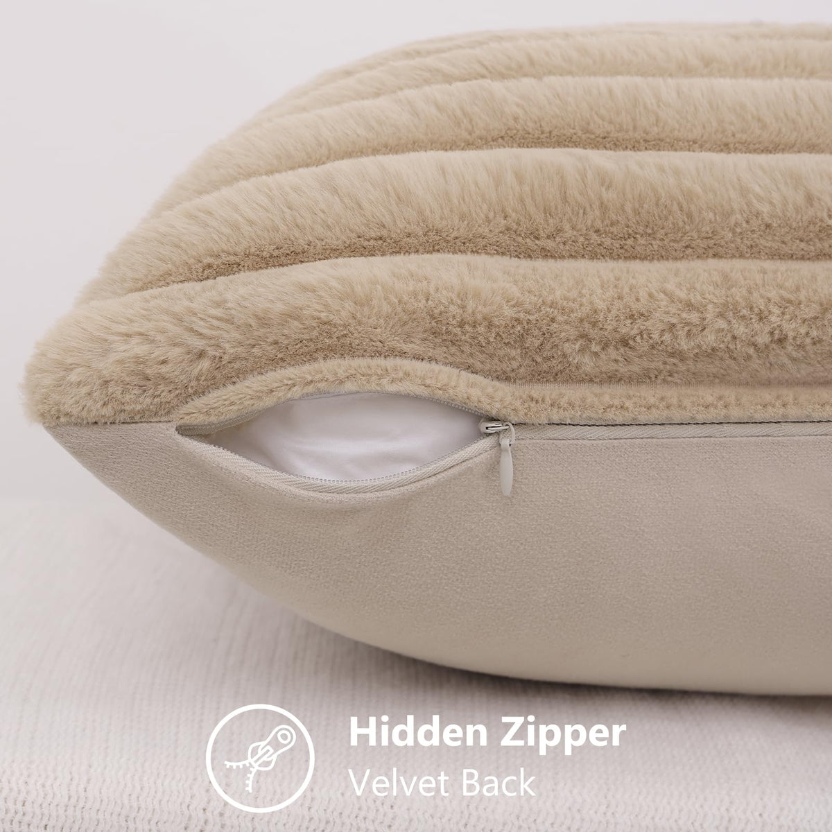 Decoruhome Faux Fur Throw Pillow Covers 20X20 Set Of 2, Decorative Soft Plush Striped Couch Pillow Covers With Velvet Back For Sofa, Bed, Living Room, Khaki