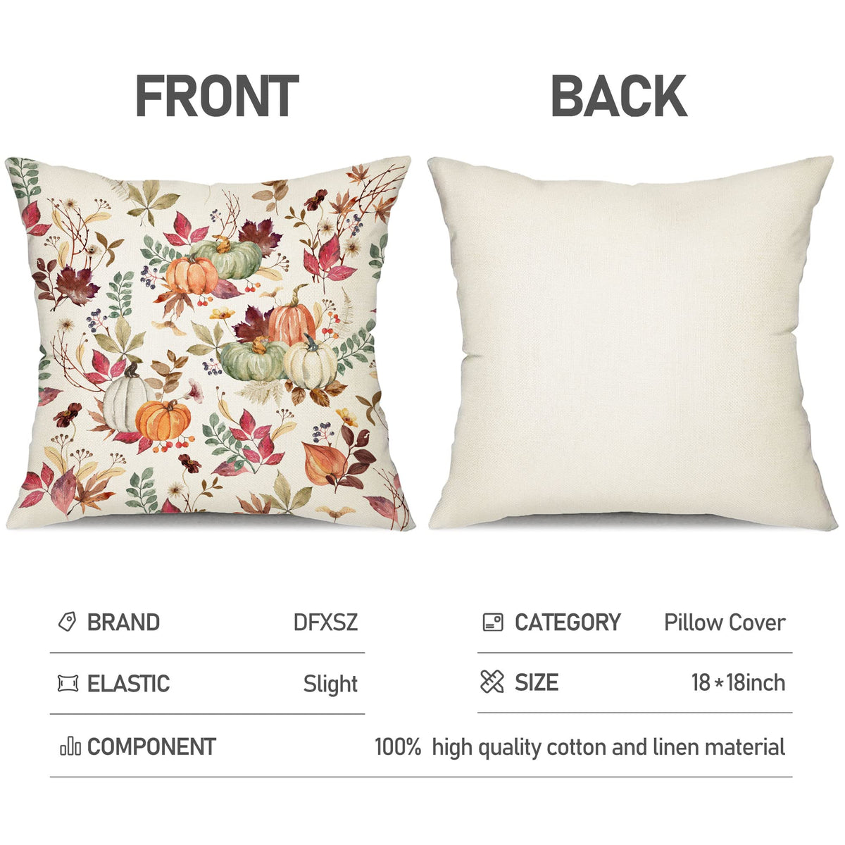 Q: What is the design like on these pillow covers?A: The pillow covers feature a decorative design with a pumpkin and maple leaf pattern on the front, while the back side is plain, making them a stylish addition to your autumn or Thanksgiving decor.
