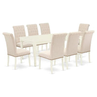 East West Furniture - Dobr9-Lwh-02- 9-Piece Dining Table Setelevate The Aesthetic Appeal Of Your Dining Space With The Acquisition Of This Exceptional 9-Piece Small Kitchen Set. The Set Comprises A Well-Crafted Wooden Dining Table And 8 Elegant Button-Tufted Dining Chairs That Exude Classic Style. The Chairs Feature Premium-Quality Linen Fabric Upholstery That Guarantees Optimal Comfort And An Unparalleled Seating Experience. The Wooden Dining Table Boasts A Linen White Solid Wood Modern Design That Seamlessly Complements The Light Beige Linen Fabric Dining Chairs' Seat And High Roll Back To Provide An Unmatched Level Of Sophistication To Your Dining Area. Crafted From Asian Wood, Also Known As Rubberwood, This Wood Kitchen Set Is Highly Durable And Resistant To Wear And Tear. Our Seasoned Carpenters Have Meticulously Fashioned This Modern Kitchen Set With A Smooth And Refined Finish, Further Enhancing Its Appeal. The Easy-To-Follow Guidelines Included In The Package Facilitate A Straightforward Assembly Process, Ensuring That You Can Enjoy Your New Dining Set Without Any Hassle. Additionally, Maintaining The Pristine Appearance Of This Kitchen Set Is Effortless, Requiring Only A Small Amount Of Time And Any Furniture Cleaner. In Summary, This Dining Nook Table Set Is A Superb Choice For Anyone Seeking To Upgrade Their Dining Room With A Tasteful And Long-Lasting Piece Of Furniture.Product Features: Frame Material: Asian Wood Fabric: Linen Fabric Fabric Color: Light Beige Wood Color: Linen White Kitchen Table Dimension: Length: 78/60; Width: 42; Height: 30. Upholstered Dining Chairs Specifications: Length: 26.5; Width: 19.2; Height: 41.2.Package Include: 8 Beautiful Upholstered Dining Chairs And A Lovely Dining Table.