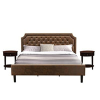 EAST WEST FURNITURE - GB25K-2HI0M - 3-PC GRANBURY BED SETIndulge in the luxury and relaxation of our stunning faux leather cushioned padding dark brown king bed, designed to enhance any room. We present a 3-piece bed set that includes a king bed frame with a headboard and two captivating mid-century nightstands. This king bed frame effortlessly complements traditional bedrooms while adding a unique touch to modern settings. Our bedroom set features two end tables with timeless and classic styling. With sturdy solid wood slats, this bed offers superior support and prevents sagging, catering to both inner-spring and foam mattresses. The smooth finish of our king bedroom furniture set makes it easy to clean with a damp cloth. Assembling this upholstered bed is a breeze, thanks to the provided step-by-step assembly instructions and hardware pack.WOODEN SET FOR BEDROOM FEATURES Material: Engineered Wood King Bedframe color: Dark Brown King Size Frame Legs Color: Black Wood Nightstand Color: Antique Mahogany Dimensions of platform bed: Length: 89; Width: 81; Height: 47. Mid Century Modern Nightstand Dimensions: Length: 23.7; Width: 23.7; Height: 28.Package Includes 1 King Bed and 2 Bedroom Nightstands.Note: Bed Frame, Headboard, and hardwood slats are provided. The mattress is not included in this Bed Set.
