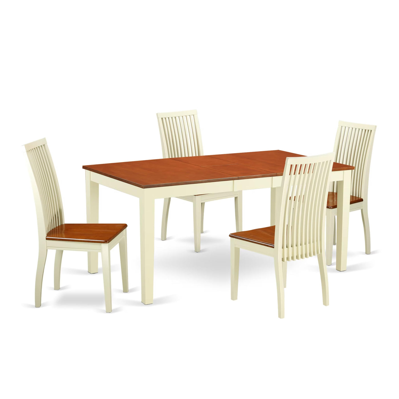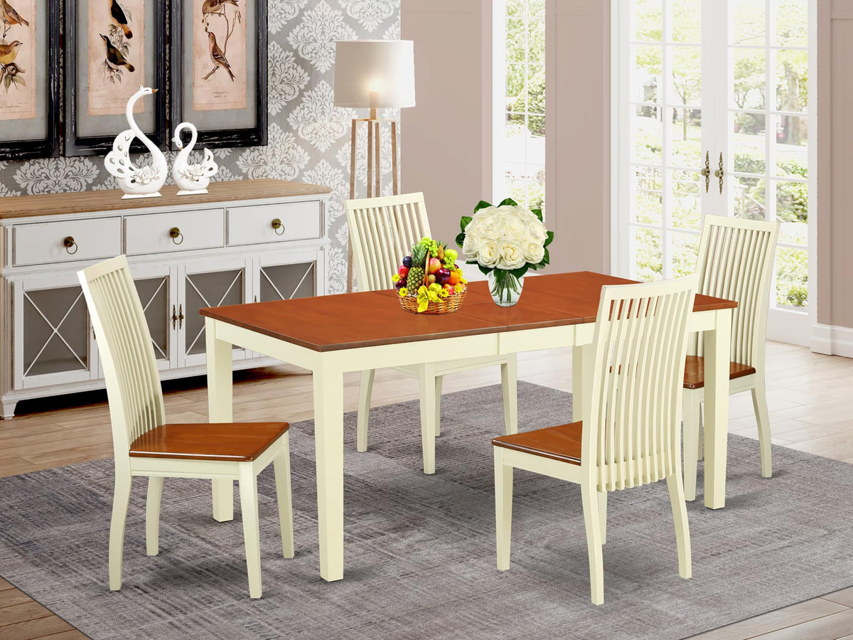 EAST WEST FURNITURE - NIIP5-BMK-W - MODERN DINING TABLE SETThe 5-piece kitchen set, complete with four elegant dining chairs and a modern butterfly leaf table. The dining room table set boasts a graceful appearance with a long-lasting finish that seamlessly extends from the cherry tabletop to the Buttermilk-finished base. Its adaptable design ensures it complements any home decor beautifully, making it a timeless addition to your living space. Additionally, the Buttermilk-finished wooden legs and comfortable seats of the dining chairs add a touch of contemporary elegance to your dining area. This timeless dining room set is skillfully constructed using Asian wood, commonly known as Rubberwood, ensuring utmost durability and stability. The dining set's frame is crafted from premium wood, providing excellent strength and stability. The straightforward yet innovative design of this mid-century modern dining set makes it a perfect complement to any kitchen space. Our team of highly experienced carpenters takes pride in meticulously creating these dining room chairs and wooden table, resulting in a flawless and high-end finish. We are dedicated to providing innovative designs and user-friendly assembly. Rest assured, you can effortlessly put together the modern dining table set following the provided instructions. Should you encounter any challenges, our customer support team is readily available to assist you.PRODUCT FEATURES: Frame Material: Asian Wood Frame Color: Buttermilk and Cherry Table Top Style: Rectangular Chair Back Style: Slatted Seat Material: Wood Chair Dimensions: Length: 21; Width: 18; Height: 39. Table Dimensions: Length: 66/54; Width: 36; Height: 30.Included in the Package: 4 Dinning Room Chairs and a Dinner Table.