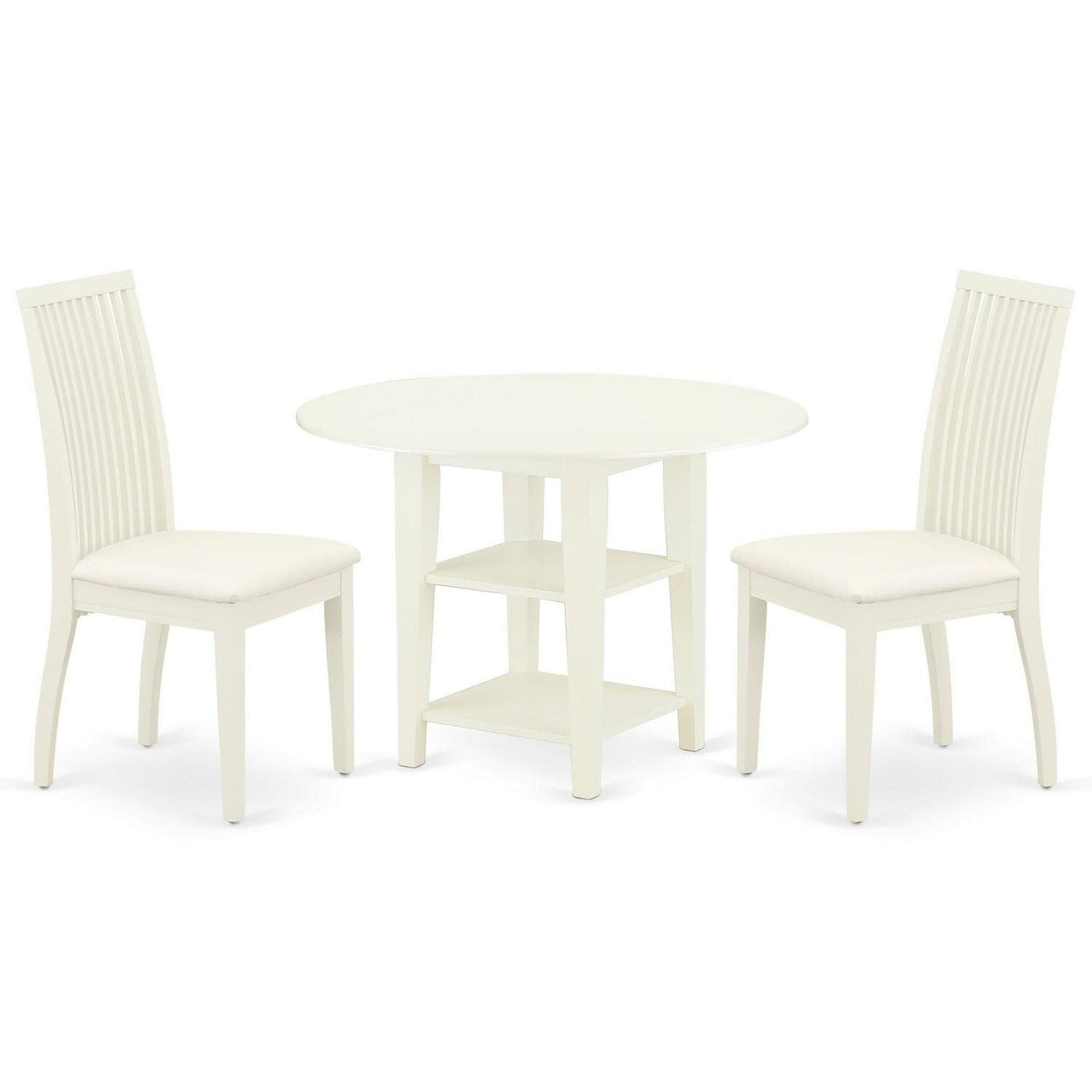 EAST WEST FURNITURE - SUIP3-BMK-W - KITCHEN DINING TABLE SETThis meticulously 3-piece dining table set ensemble consists of a singular dining table and 2 matching dining chairs. It exudes an enduring sense of sophistication, elevating the ambiance of any residence. These versatile pieces exhibit a timeless design that seamlessly integrates with a diverse range of existing interior décors. The contemporary dining set features an elegant Drop Leaf Round dining table adorned with a chic cherry tabletop and tastefully finished Buttermilk legs. Similarly, the kitchen chairs are impeccably appointed with cherry seat colors and Buttermilk leg finishes. Our kitchen dining room set is meticulously crafted from high-quality Asian rubberwood, renowned for its exceptional durability, strength, stability, and the potential to become a cherished heirloom. This elegant dining table set has been expertly fashioned by a highly skilled carpenter, resulting in its impeccable appearance and superior quality. The seat of this kitchen chair is meticulously crafted from high-quality hardwood, providing an exceptional sitting experience. Its tall backrest seamlessly aligns with the natural curvature of the spine, ensuring optimal comfort with each use. Moreover, the generously proportioned seat enhances overall comfort. This dining table set is a superb choice for adding a touch of sophistication to your kitchen area.PRODUCT FEATURES: Frame Material: Asian Wood Frame Color: Buttermilk and Cherry Table Top Style: Round Chair Back Style: Slatted Seat Material: Wood Chair Dimensions: Length: 21; Width: 18; Height: 39. Table Dimensions: Length: 42; Width: 42; Height: 29.5.Included in the Package: 2 Modern Dining Chairs and a Wooden Kitchen Table.