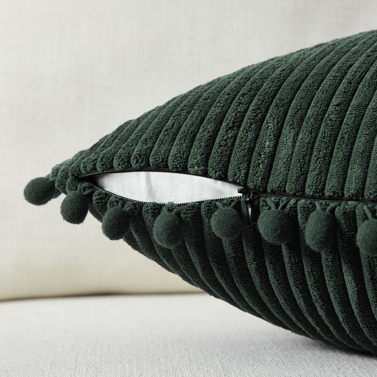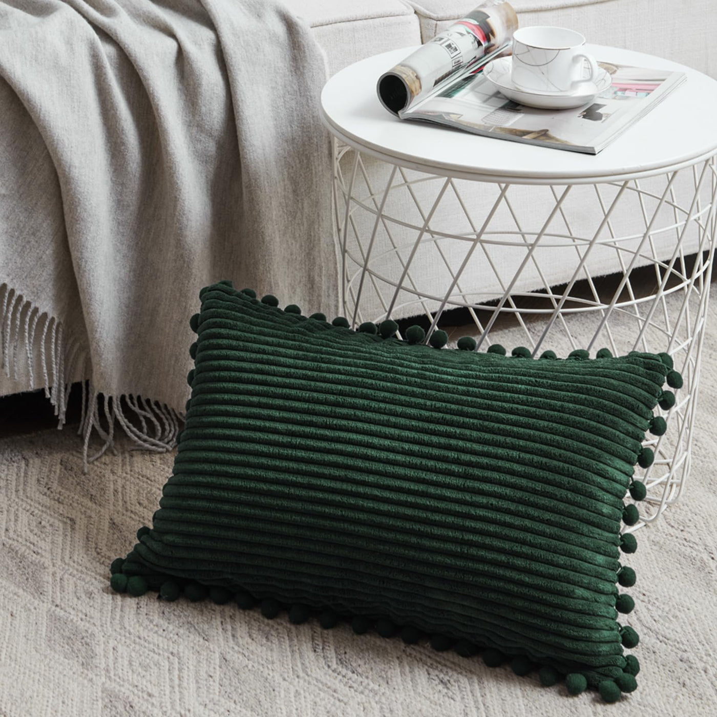 Fancy Homi 2 Pack Dark Green Lumbar Decorative Throw Pillow Covers 12X20 Inch With Pom-Poms For Couch Bedroom Sofa, Soft Corduro