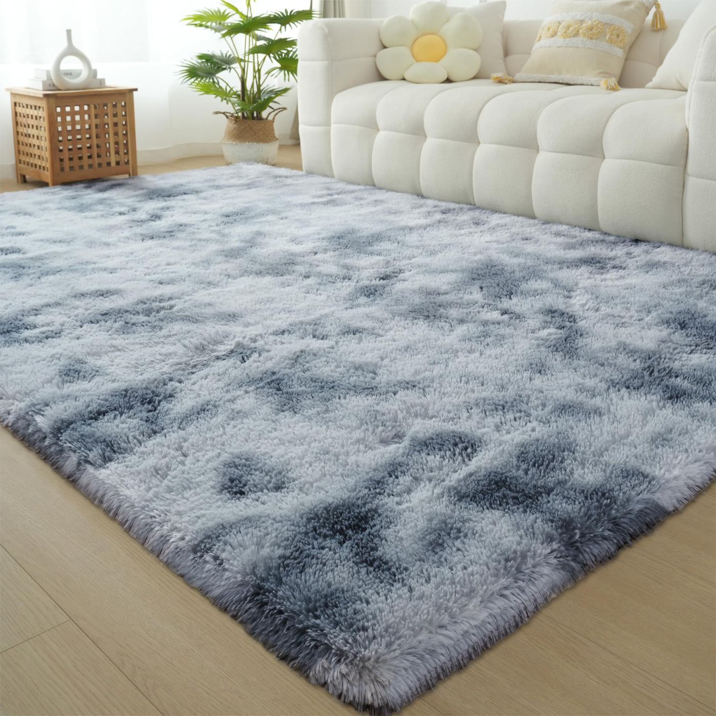 Q: What is the size of the Fluffy Area Rug?A: The Fluffy Area Rug measures 6 feet by 9 feet, making it a perfect size for various indoor settings such as living rooms, bedrooms, and nurseries.
