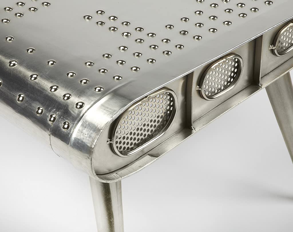 This table is riveting, soaring with the flair of an airplane wing and guaranteed to help a room take flight. Resplendent in shimmering aluminum, the table sits atop three matching legs that taper down for a very smooth landing indeed.
