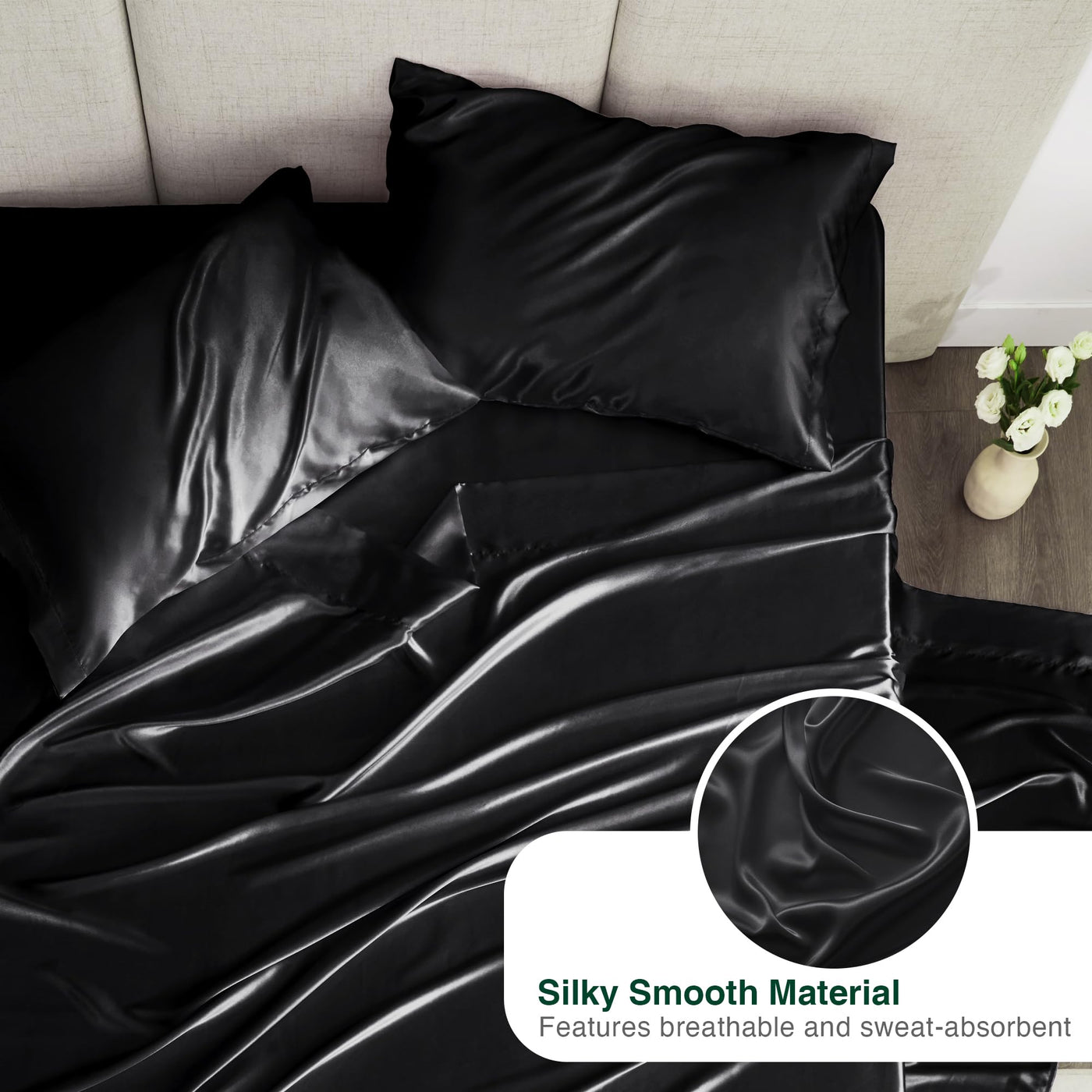 Love'S Cabin California King Satin Sheet Sets - 4 Piece Black Silky Satin Sheets Bed Set With Deep Pocket, Luxury Silk Feel Satin Cal King Sheet Set (1 Flat Sheet,1 Fitted Sheet,2 Pillow Cases)