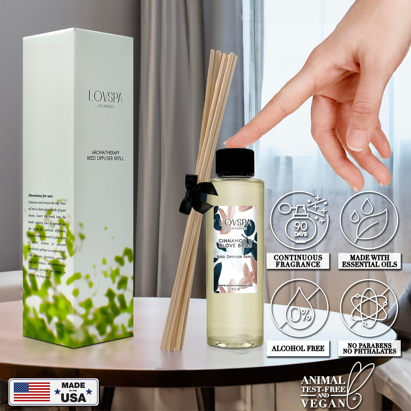 Lovspa Cinnamon & Clove Buds Combines The Autumn Scents Of Sweet Cinnamon & Aromatic Clove Buds With Warm Musk, Spicy Tonka Bean And Subtle Woody Notes To Create A Festive, Aromatic Fragrance. Replenish Your Favorite Lovspa Fragrance With Our Diffuser Refill Oils. Lovspa Oil Refills Are The Perfect Way To Refill An Existing Diffuser Or Create A Dramatic Diffuser Accessory Of Your Own. A Sustainable And Cost-Effective Way To Refill Your Oil Diffuser And Top Off Your Existing Diffuser Economically. ? Each Refill Bottle Contains 4 Ounces Of Strongly Scented Oil For Long Lasting Enjoyment. ? Includes An Extra Set Of 8 Inch Reed Sticks To Optimize Fragrance Throw. ? Crafted From The Highest Quality Essential Oils. ? 100% Vegan. Never Tested On Animals. ? Proudly Manufactured In The Usa Pro Tips: ? Replace The First Set Of Reeds When The Diffusion Rate Slows Down. ? Control Fragrance Intensity By The Number Of Reeds Used And The Frequency Of Flipping The Reeds. Lovspa'S Fragrant Reed Diffuser Oils Are The Perfect Way To Give Your Home An All-Day Soft Background Aroma And Keep It Smelling Fresh For Months. Our Products Are Made With Care In The Usa By People Like You, Who Really Like Their Home To Smell Nice And Who Care About The Environment. We At Lovspa&Reg; Fragrances Understand That Home Fragrance Is A Very Personal Choice With An Enormous Power To Enhance The Home And We Thank You For Your Support Of Our Small Business. Lovspa&Reg; Fragrances Give Any Space A Luxurious Ambiance And Love The Air You Breathe&Reg;.