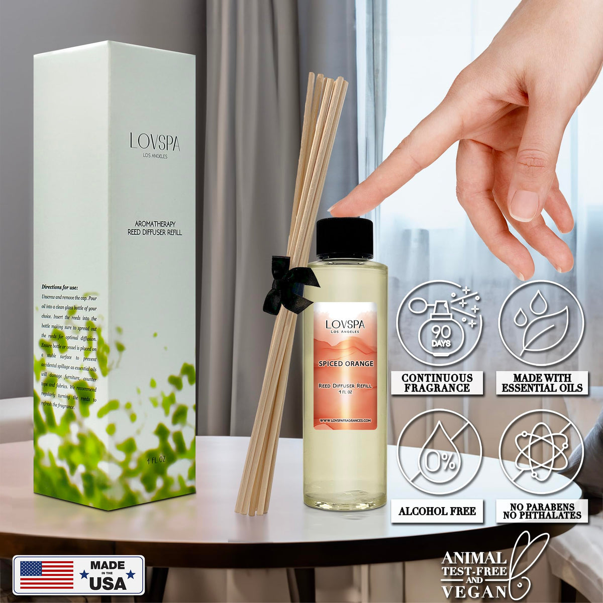 Holiday Spiced Orange Blends Orange Peel With Warm Spiced Cinnamon Sticks, Clove And Citrus Tones To Open This Autumn Scent. The Essence Of A Beautiful Fall Season Is Captured In This Fragrance With Notes Of Mandarin Orange, Cinnamon, Clove & Creamy Vanilla - Enhanced With Hints Of Siberian Pine And Cranberry Easily Replenish Your Favorite Lovspa Fragrance With Our New Refills Available Online Only.✨ Our Oil Refills Are The Perfect Way To Refill An Existing Diffuser Or Create A Dramatic Diffuser Accessory Of Your Own. ✨ Comes In An Elegant 4-Oz. Bottle With Resealable Cap. Includes An Extra Set Of Reeds To Optimize Performance Throughout The Life Of The Diffuser. Replace The First Set Of Reeds When The Diffusion Rate Slows Down. ✨ Easy To Use, Simply Refill Your Glass Lovspa Diffuser Bottle & Place The Reeds In The Bottle. Reeds Absorb The Scented Oil, Draw It To The Top And Diffuse It Into Air. ✨ Sustainable And Cost-Effective Way To Refill Your Scent Diffuser. Top Off Your Existing Fragrance Diffuser Economically - Packaged In Recyclable Pet Bottles For Zero Waste; Just Decant The Liquid Into Your Decorative Reed Diffuser Bottle Whenever Needed. ✨ The Perfect Add-On To A Birthday, Mother'S Day, House Warming Or Hostess Gift Alongside Our Beautiful Reed Diffuser Sets. Lovspa'S Luxurious Scent Diffusers Are The Perfect Way To Give Your Home An All-Day Soft Background Aroma And Keep It Smelling Fresh For Months. The Elegant Lovspa&Reg; Collection Of Reed Diffusers Will Transform Your Home Into A Fragrant Spa Retreat. We At Lovspa&Reg; Fragrances Understand That Home Fragrance Is A Very Personal Choice With An Enormous Power To Enhance The Home And We Thank You For Your Support Of Our Small Business. Lovspa&Reg; Fragrances Give Any Space A Luxurious Ambiance And Love The Air You Breathe.
