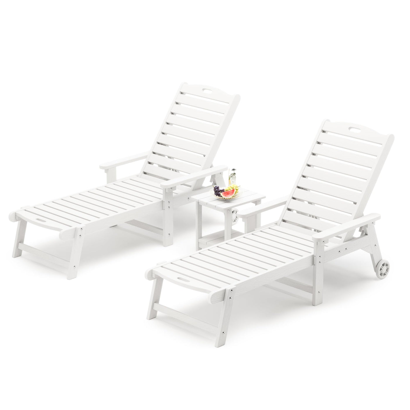 Lue Bona Chaise Lounge Chairs Set With Table, 3-Piece, Hdps Material, 3-Year Warranty, Patio Lounge Chair With Adjustable Backrest, Resin Pool Lounge Chairs With Wheels For Outside, Poolside, White