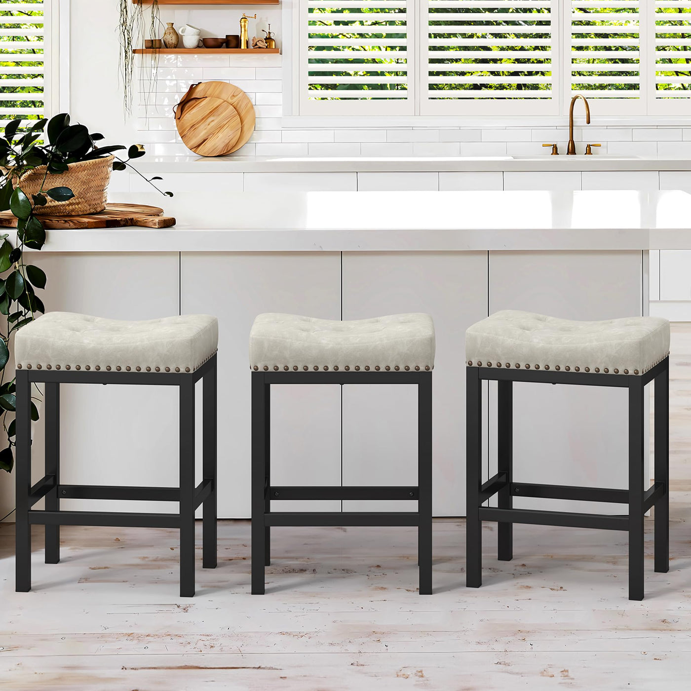 Lue Bona Counter Height Bar Stools, 24 Inch Saddle Backless Bar Stools Set Of 3 For Kitchen Counter, Faux Leather Counter Stools With Black Metal Legs, Modern Kitchen Island Stools, Light Beige Gray