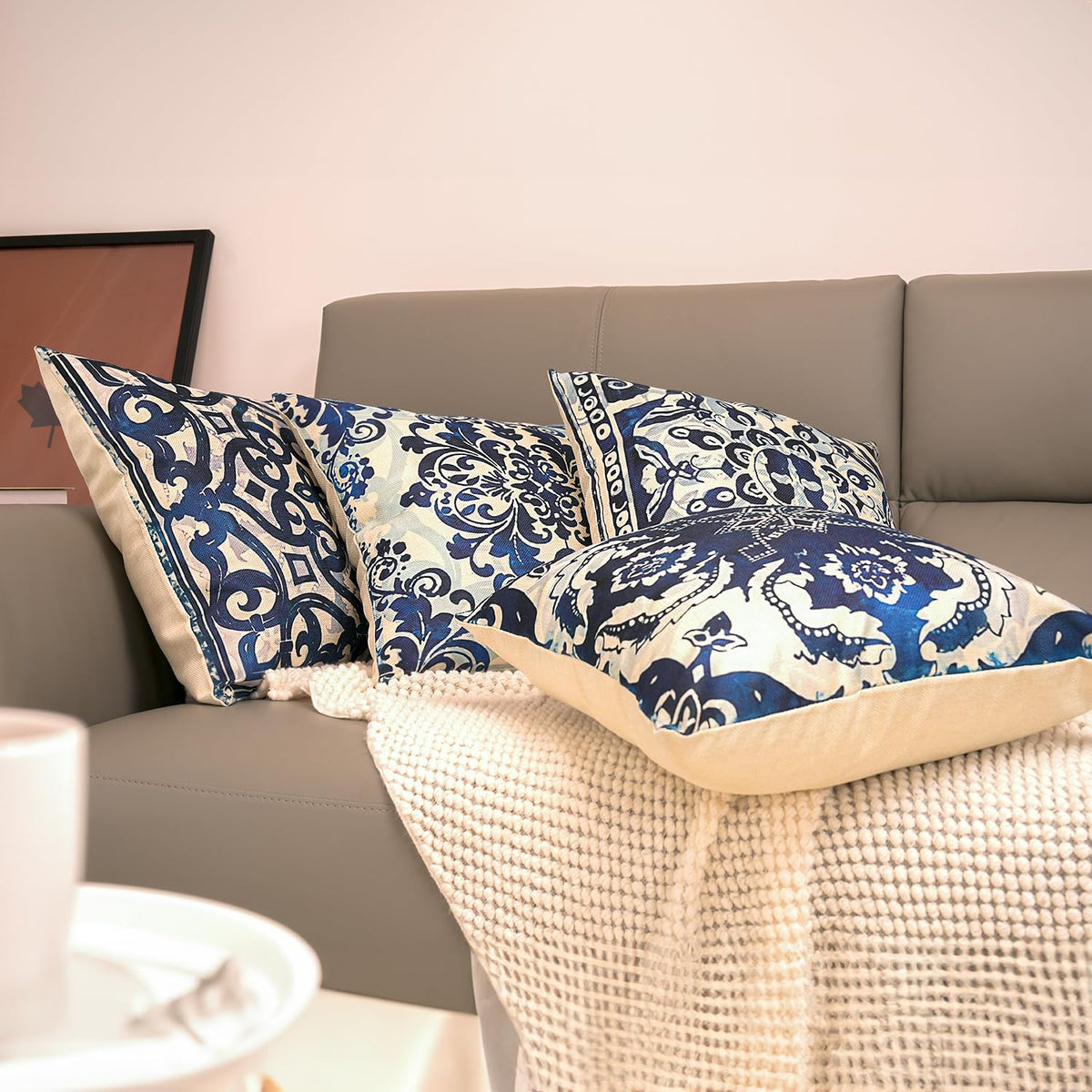 M-Qizi Blue Throw Pillow Covers - Linen Blue Pillow Covers 18X18 Set Of 4, Decorative Blue And White Pillow Covers, Chinoiserie