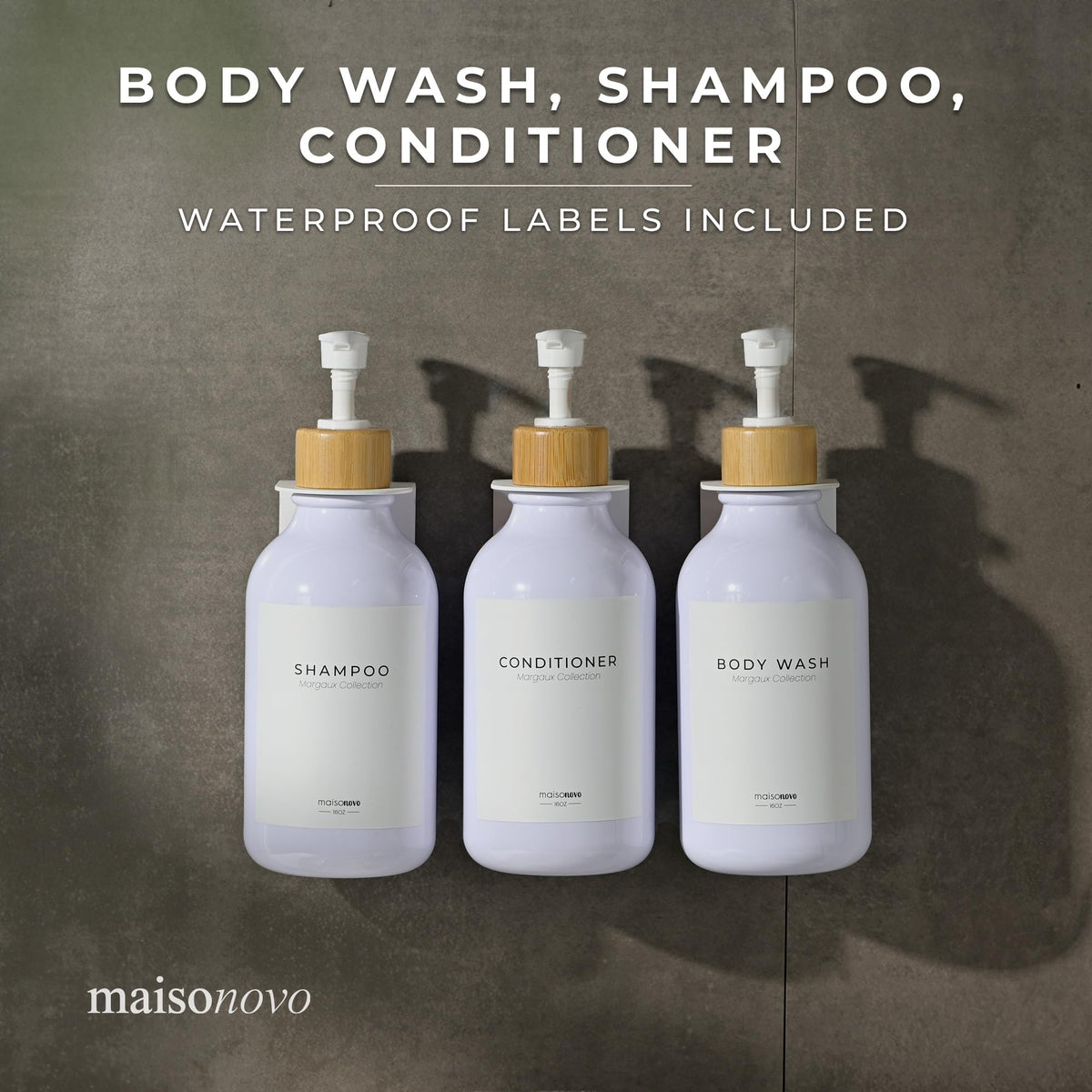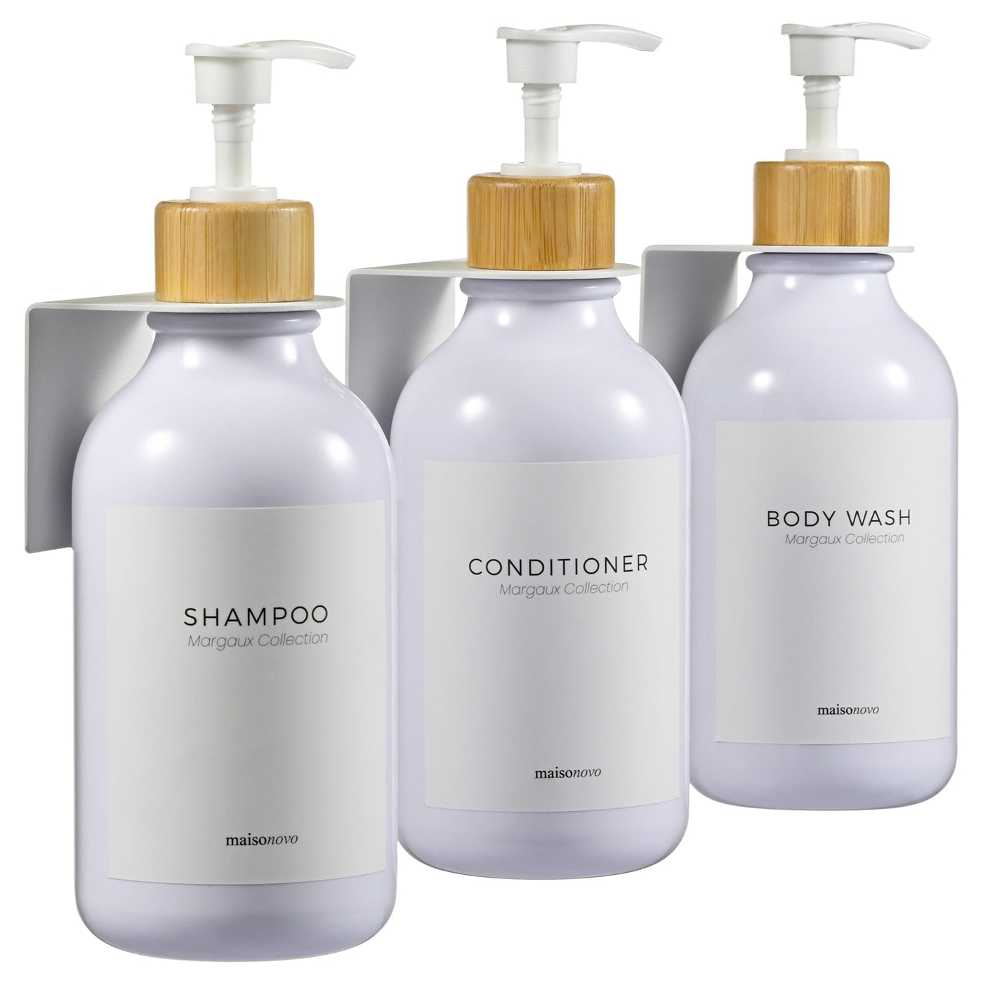 MAISONOVO Wall Mounted Shampoo and Conditioner Dispenser Set of 3 - 16.9 fl oz White Plastic Bottles with Bamboo Pump - No Drill