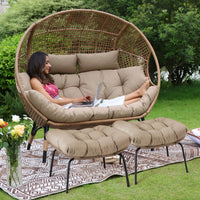 Nicesoul Modern Boho Oversize Double Egg Chair Is A Perfect Blend Of Style And Comfort, Offering A Unique Seating Solution For Both Inside And Outside Spaces, Including Living Room, Bedroom, Family Room, Sunroom, Den, Study, Vaulted Room, Conservatory, Patio, Deck, Porch, Backyard, Garden, Front Yard, Balcony, Terrace, Poolside, Courtyard,Veranda, Rooftop, Gazebo, Pergola, Lanai, Outdoor Living Space, Patio Area, Lawn, Side Yard, Greenhouse, Pavilion. Available In Beige/Cream, Brown/Tan, And Gray/Grey For Your Special Outdoor Décor. This Oversized, Stylish Egg-Shaped Chair Comfortably Accommodates Two People, Making It Ideal For Couples, Small Family, Friends. It Comes With Two Ottomans/Footrests For Extra Relaxation Or Can Be Purchased Without Footstools. The Chair’S 6.5-Inch Thick Cushions Provide Exceptional Comfort, Ensuring Long-Lasting Relaxation, While The Dual Headrests With Adjustable Straps Offer Customizable Neck Support. Perfect For Those Who Want A Plus-Size Option, This Chair'S Spacious Design Is Ideal For Adults Of All Sizes. Crafted From Pe Rattan/Wicker, It Boasts A Strong Sturdy Alloy Steel Frame That Is Uv-Resistant, Water-Resistant, Weather-Resistant, Ensuring It Will Withstand The Elements And Easy To Clean And Maintain, Suitable For Both Indoor And Outdoor Use, Durable Over Time. Whether You'Re Creating A Bohemian Vibe, Setting Up A Relaxing Reading Nook, Or Simply Lounging And Napping, It Is The Perfect Choice. With Its Comfortable Seating And Soft Cushions, It’S An Excellent Piece For Lounge Areas And Reading Corners. Whether You'Re Looking For A Two-Person Loveseat Or A Dual Seat, It Offers An Extra Wide Seating Experience That Combines Functionality And Luxury. For Those Looking For A Rust-Proof And Heavy-Duty Piece Of Furniture, This Chair Offers Both Reliability And Style. Its Two-Seater Design With Xxl Size And Extra-Large Seating Area Make It A Great Choice For Couples, Plus Size Individuals Or Those Who Simply Want More Room To Relax.