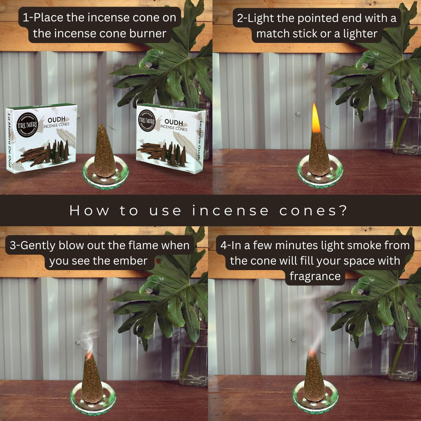 Q: How long do the incense cones burn?A: Each TRUMIRI Oud Incense Cone typically burns for approximately 30 minutes, allowing you to enjoy the captivating fragrance for an extended period during your relaxation or meditation sessions.