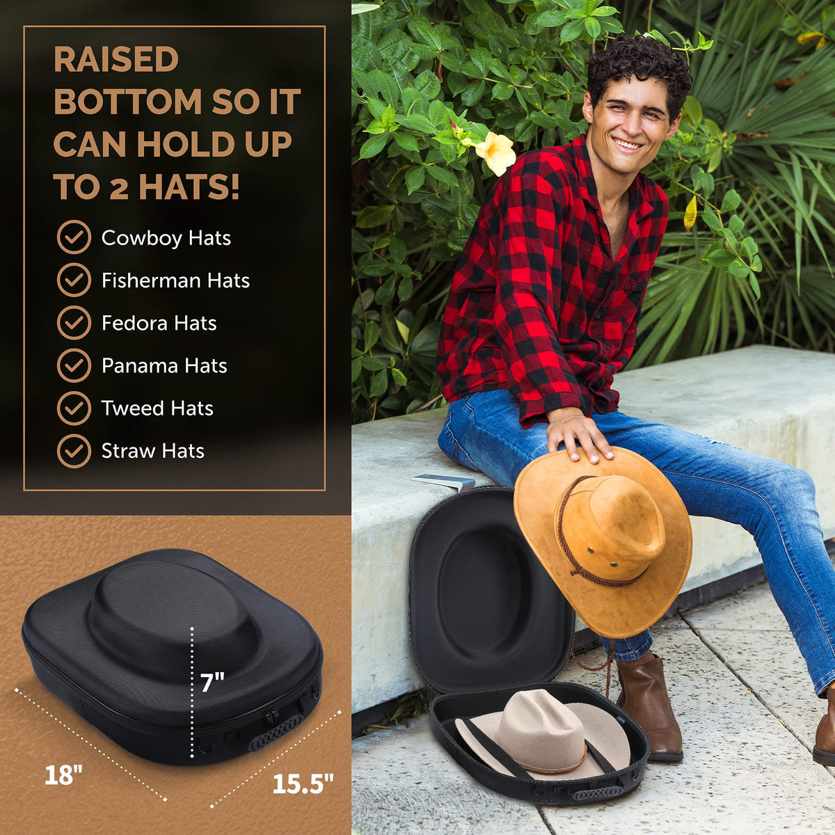 SPACIOUS AND ACCOMMODATING: With generous interior dimensions of 17.9 x 15.7 x 6.9, this case comfortably holds up to 2 hats. It is perfect for a variety of styles including Cowboy, Fedora, Panama, Fisherman, Tweed, Straw, Boater, Trilby, and Sun Hats.
