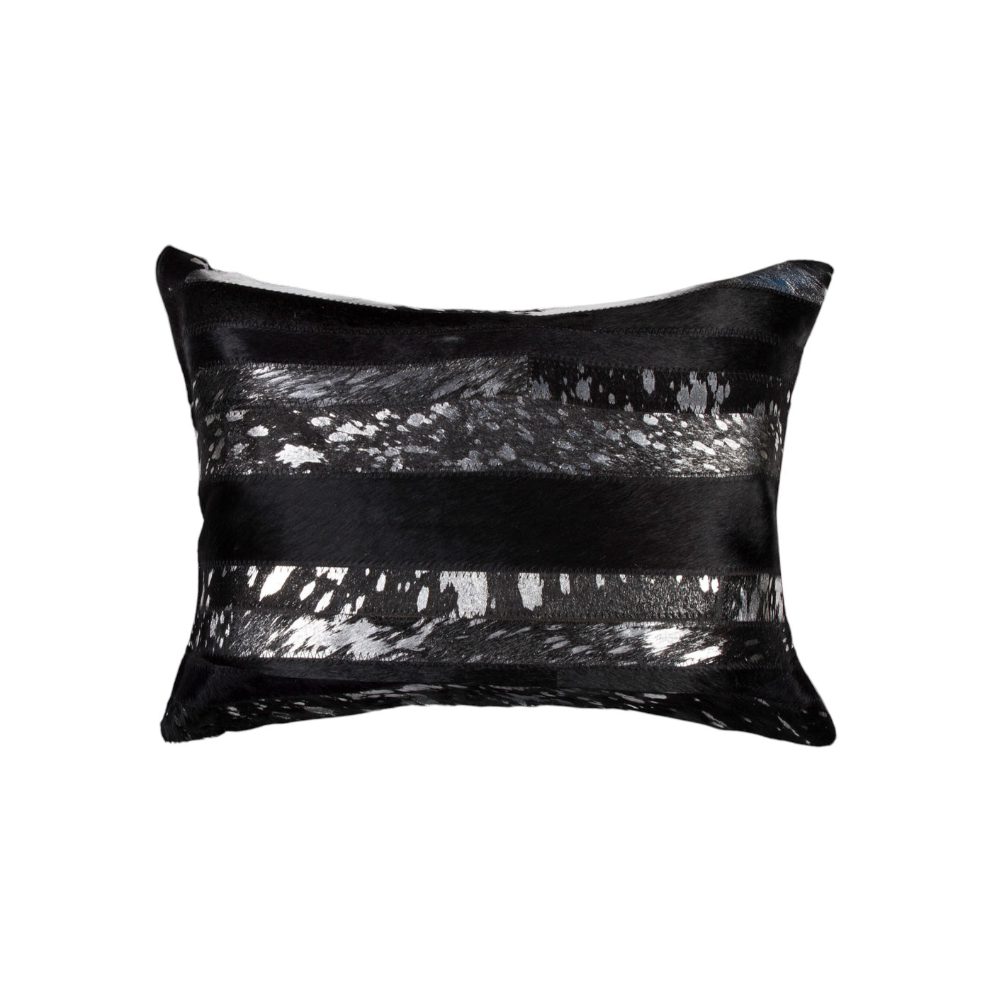 The set of two 12-inch x 20-inch black and silver striped cowhide lumbar throw pillows with glitter is the perfect decorative accessory for your home. The luxurious black and silver coloring of the genuine cowhide on these pillows will add dimension and texture to your space. Elegantly chic, these pillows are the epitome of luxury. Super soft and built to hold its shape, this polyfill-filled pillow is a great option. Decorative pillows are a great way to change up the look and feel of your space easily and quickly. A great decorative accessory to add color and dimension to your favorite chair, accent your sofa, or to use as part of your bed ensemble. 12-inch h x 20-inch w x 5-inch d.