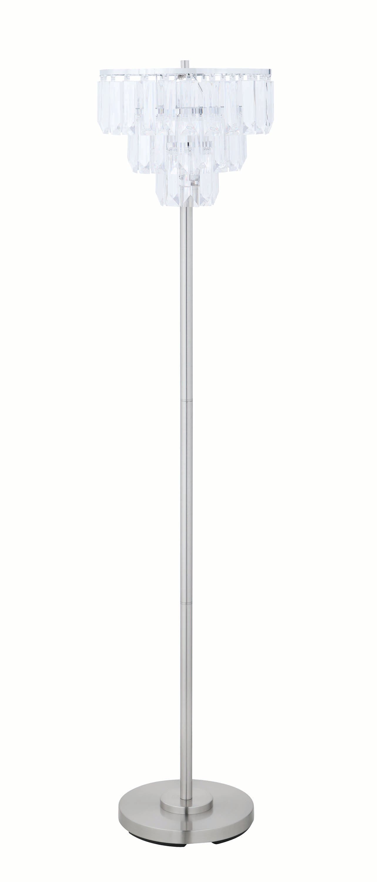 This silky smooth crystal floor lamp has a polished brilliance that you'll appreciate. It's versatile enough to add elegance and shine to a formal living room or spruce up a stuffy office. Its sleek silhouette is anchored by a tiered round base crafted of smooth chrome. The slender profile continues with a chrome stand topped by magnificent crystal pieces that dispense dynamic colors and accents to any room. Use it to light up a contemporary console table or place it between to accent side chairs and have engaging conversations while sipping on after-dinner brandies.