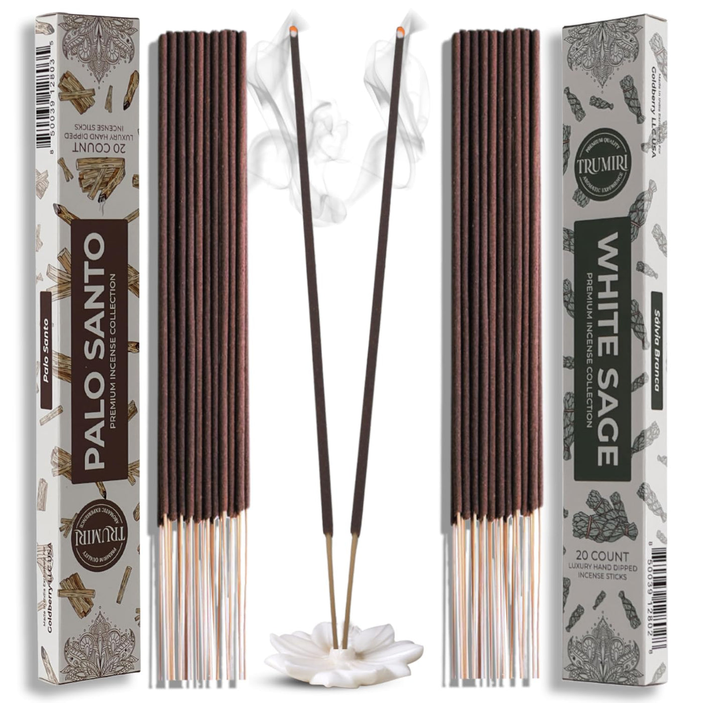 Q: What is the difference between Palo Santo and White Sage incense?A: Palo Santo is known for its sweet, calming aroma that uplifts the spirit, while White Sage is often used for its cleansing properties and earthy scent. Together, they create a balanced and harmonious fragrance experience in Trumiri's combo pack.