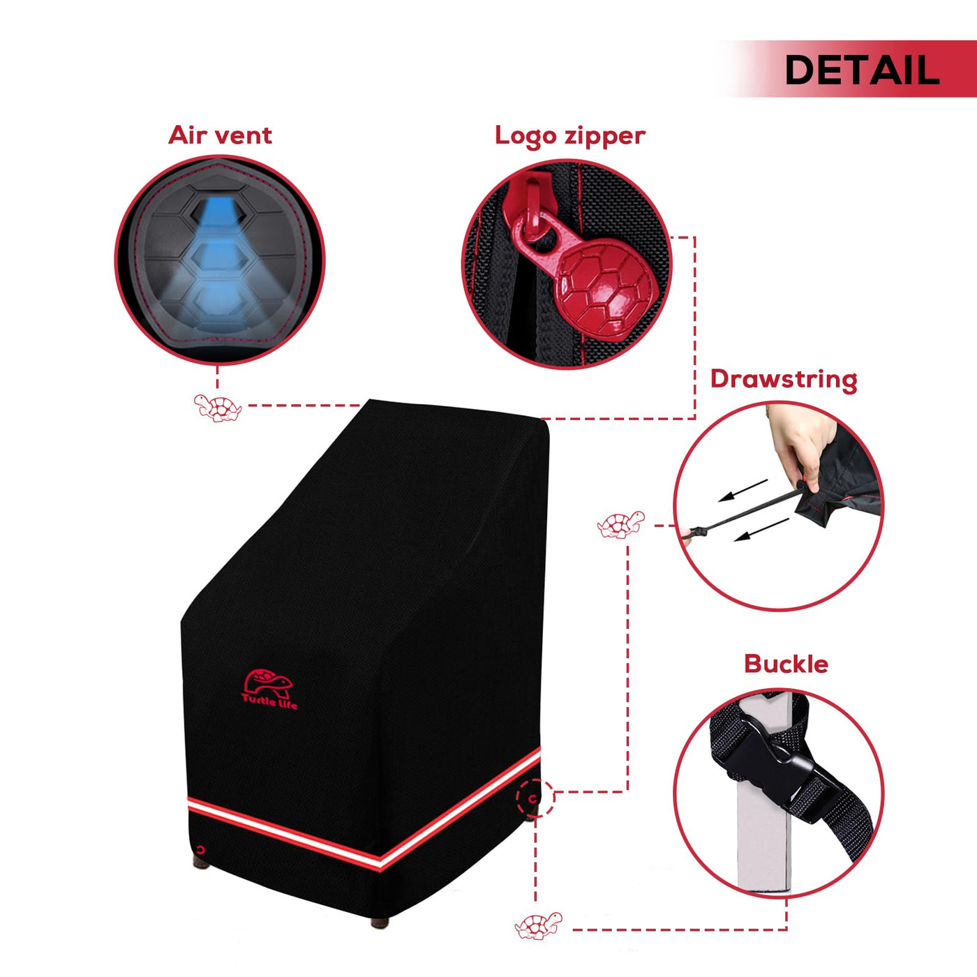 Wishing you peace, joy and happiness through everyday.?High Quality?Turtle Life stackable patio chairs cover uses high quality materials .The fabric with is tough and durable that give your grill a full protection over seasons from harsh environment.?Waterproof, Splash Resistant, Dust Proof, Rip Resistant, UV Resistant?New upgrade PVC coating make these protections even more powerful. Strong fabric and fine stitching technology to protect the fabric from cracking and tearing. ?Eyelets and Stoppers?Adding eyelets and stoppers to the bottom to fix it. Prevent being blown away, and it is easy to put away. ?Warranty?For 2 years from the date of purchase, the product is warranted for the original purchaser to be free from defects in material and workmanship through normal use. This warranty does not cover normal wear and tear to the set cover; set cover which have been physically abused or misused.