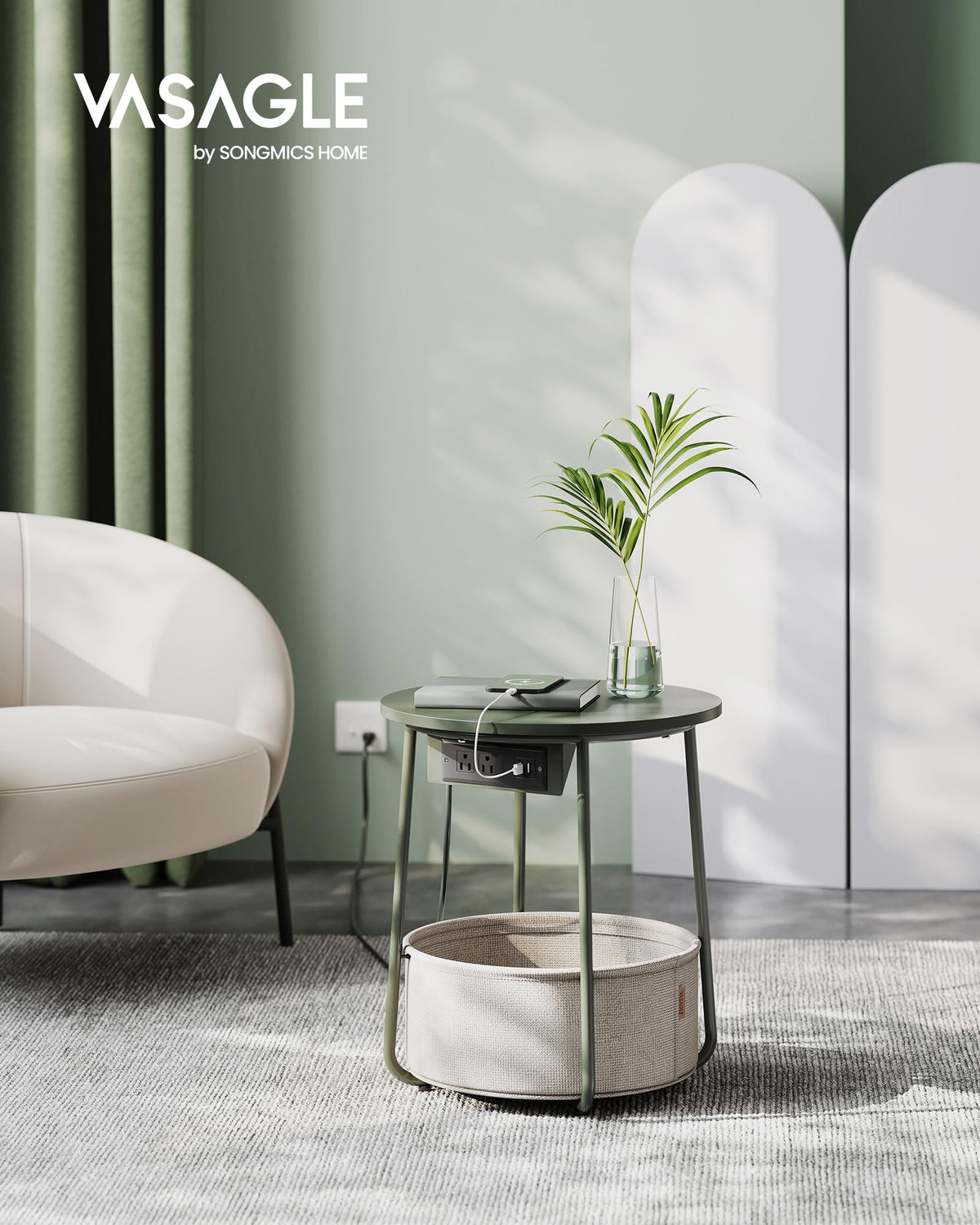 Vasagle Side Table With Charging Station, Round End Table With Fabric Basket, Nightstand With Power Outlets Usb Ports, For Living Room, Bedroom, Modern, Forest Green And Cream White Ulet228C04