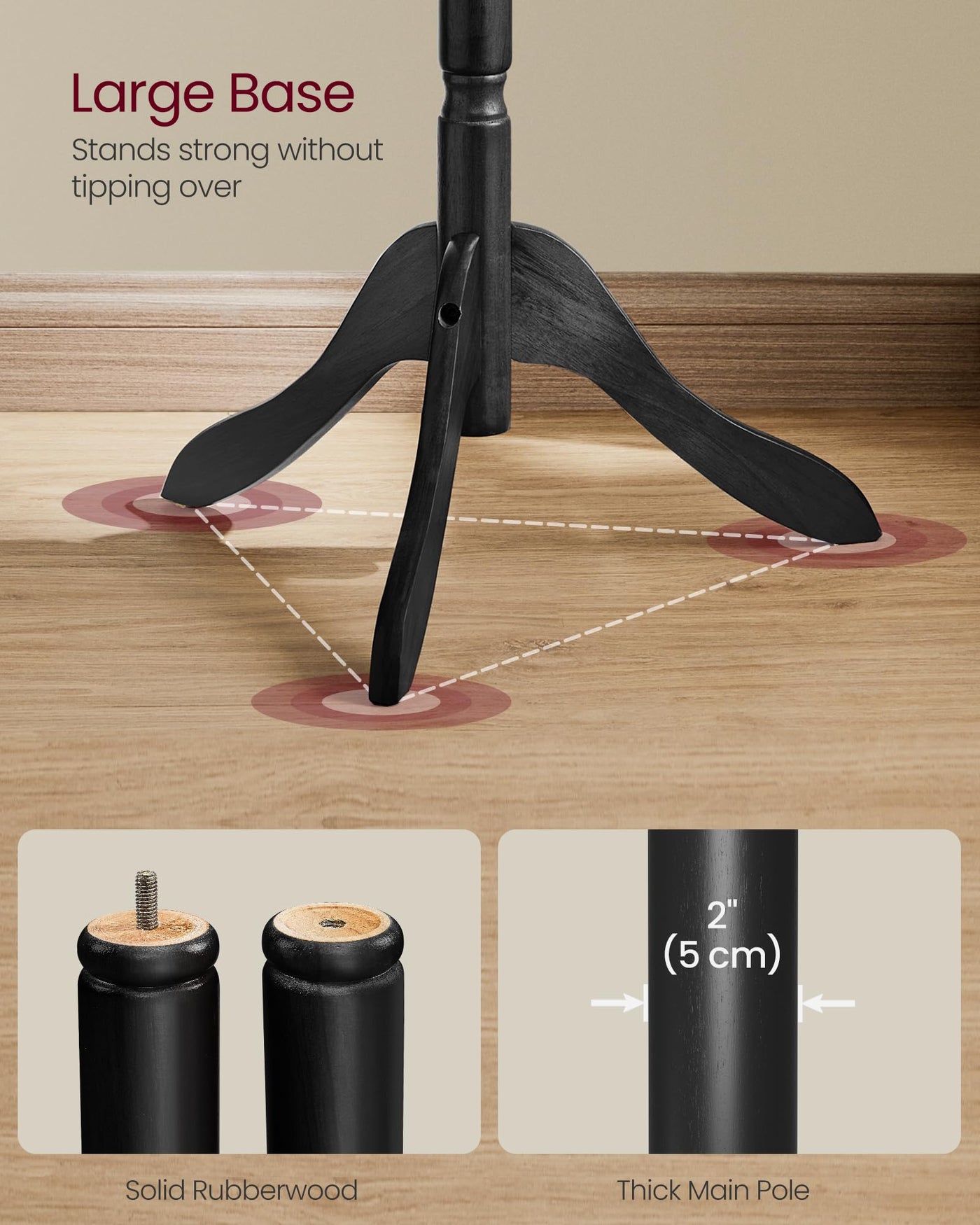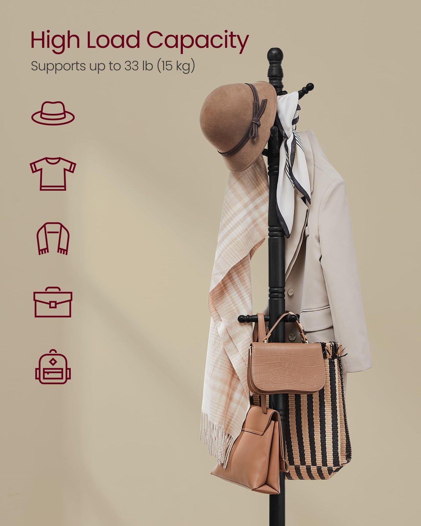Specifications: - Color: Ink Black - Material: Rubberwood - Product Size: 18.5'D x 18.5'W x 70.5'H (47 x 47 x 179 cm) - Length of Each Hook: 5.2' (13 cm) - Product Weight: 6.8 lb (3.1 kg) - Max. Static Load Capacity Per Hook: 11 lb (5 kg) - Max. Static Load Capacity Total: 33 lb (15 kg) Package Contents: - 1 x Coat Stand - 1 x Instructions VASAGLE Notes: - Do not expose the product to direct sunlight for extended periods of time. - Do not touch the product with sharp items. - Distribute the load evenly to avoid any risk of overturning. - When removing clothing, please lift upwards rather than pulling downwards to prevent toppling.