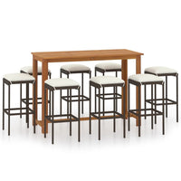 vidaXL 9-Piece Farmhouse-Styled Patio Bar Set - Brown PE Rattan Stools with Cushions, Solid Acacia Wood Table with Oil Finish - Ideal for Garden, Patio, Terrace