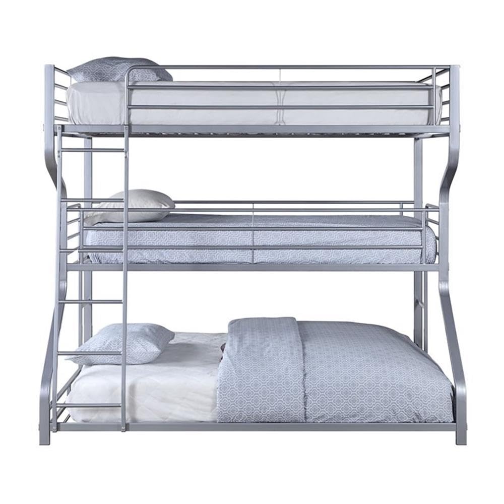 The Triple Bunk Bed Is The Perfect Addition To Any Child S Room. With Unique Industrial Style, This Twin Over Full Over Queen Metal Bunk Bed Features An Open Design With A Built-In Ladders And Easy Access Guardrails In A Spectacular Silver Or Gunmetal Finish. The Bunk Bed'S Clean Line Design Will Go With Various Styles Of Case Good Finishes And Will Become The Focal Point In Your Kids Bedroom. This Fashionable Bunk Bed Will Accent Your Other Bedroom Furniture, Transforming A Room From Ordinary Into Something Playful And Unique Setting.