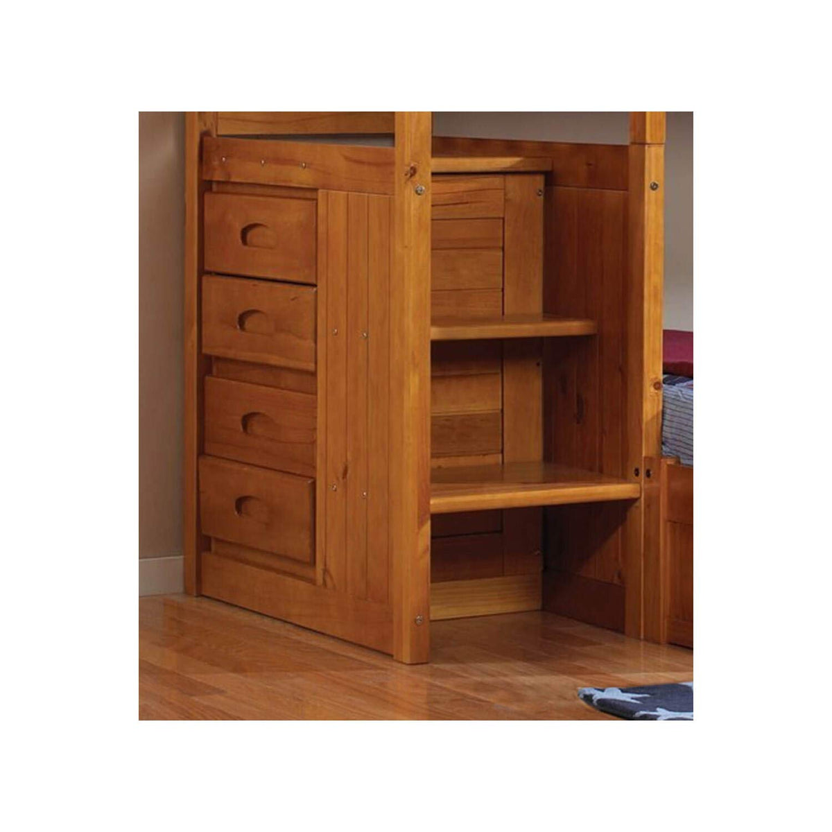 Add Style And Function To Your Children'S Bedroom With This Twin-Over-Twin Staircase Bunk Bed In A Rich Honey Finish! The Ready-To-Assemble Unit Features A Built-In, Four-Drawer Chest And Reversible Staircase, Magazine Rack, And Three-Drawer Under-Bed Storage Unit. The Stair Treads Are 17.25" Wide For A Safe Climb To The Upper Bunk. Quality With Solid-Wood Construction Makes This Bunk Bed A Great Buy. Stair Treads 17.25"W.