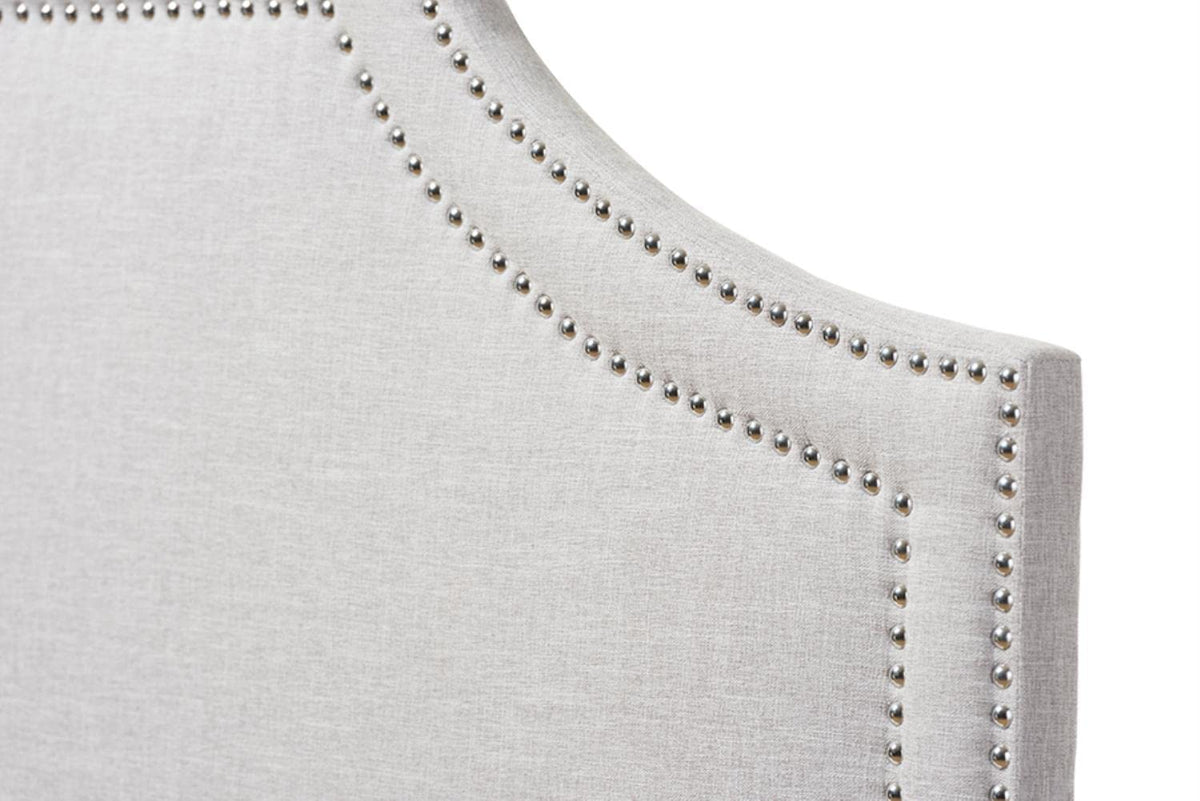 Featuring clean lines, subtle hues and a chic, laidback aesthetic, the Avignon headboard offers your bedroom interior simple, sleek elegance with a touch of trendy metallic. The cut-out corners channel the elegance of an iconic style icon with the Avignon modern and contemporary upholstered headboard. For those seeking to add a touch of luxury to their bedroom, the Avignon headboard will almost instantly glam up any space with its double silver nail heads trims, creating that Hollywood glamour you have been dreaming of. Constructed of solid rubberwood frame and plywood, the headboard is built to last. Soft polyester fabric in over the foam filled headboard provides ample comfort for you to lean against. Leg supports are invisible once set up and can be adjusted to suit the height of your ensemble for convenience. Headboard sits between the wall and the ensemble frame, attaching not to the bed base but to the legs, for stability. Made in Malaysia, this headboard requires assembly.