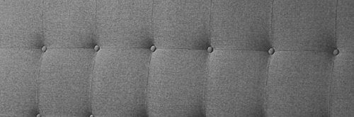 Wooden and metal bed frames are things of the past – update your bedroom with the stylish Favela Upholstered Bed. The king-sized headboard, slats and footboard are foam-padded, button-tufted and upholstered in a beautiful, versatile gray linen blend. Made with a wooden frame and black wood feet, sound construction is not left by the wayside. The Favela is a platform bed, so does not require a box spring: wooden slats (included) serve the same purpose. Only a mattress and bed linens (not included) are required. In the event cleaning is necessary, spot cleaning is advised. 83.5"W x 91"D x 52.75"H, footboard height: 12.5", side rail: 12.5", height to top of slat: 11", height of legs: 2.5". Features: - Contemporary platform bed (requires only a mattress; wooden slats included) - King size - Wooden frame - Polyurethane foam padding - Gray linen fabric - Black wooden legs - Assembly required - This style offered in king size and queen, both in light beige or gray (each sold separately) - Spot clean only.