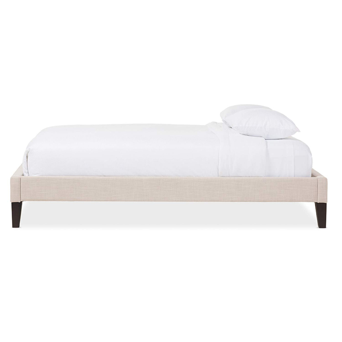 The contemporary look is sleek, simple and modern. To create your contemporary bedroom, Lancashire will be a good choice that does not break your bank. Featuring detailed framework, high quality beige linen fabric completes the look of this stylish and durable king size bed frame. Constructed of eco-friendly solid rubberwood frame, the Lancashire features low side rails and low footboard, providing an illusion of space to a small room. Wenge finishing tapered wooden legs lift the bed frame off the floor to create under bed clearance for storage. The bed frame could be used on its own or matched with selected headboards to create the contemporary look you desired. Made in Malaysia, the Lancashire requires assembly.Features Modern platform bedPairs high-quality upholstery with tapered wooden legs, for a stylish, durable frameBeige linen-blend upholsterySolid rubberwood frame with wenge finishing tapered legsCan match with headboard or use it without headboardMDF support slats includedDimensions: 14.24" High x 79.76" Wide x 86.19" Deep; Headboard: 14.24" High x 79.76" Wide x 2.73" Thick; Siderail: 14.24" High x 86.19" Wide x 0.98" Thick; Footboard: 14.24" High x 79.76" Wide x 2.73" Thick; Top of Slat: 11.21" High; Legs: 7.22" HighSTYLE: ContemporaryCOLOR: BeigeMATERIAL:Fabric "Polyester 100%"/Rubberwood/MDF/Plywood/LVL/Foam