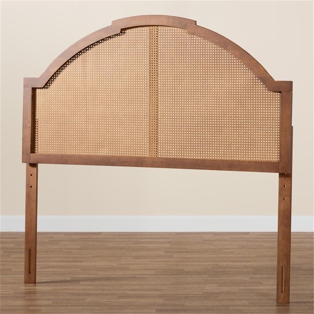 - Material: Wood, rattan - Finish: Ash walnut - Upper back features 6 predrilled holes for 5 different height adjustment options. - Rounded outline - Woven synthetic rattan embellishments - Bed frame compatible - Traditional queen size headboard - Constructed from rubberwood.