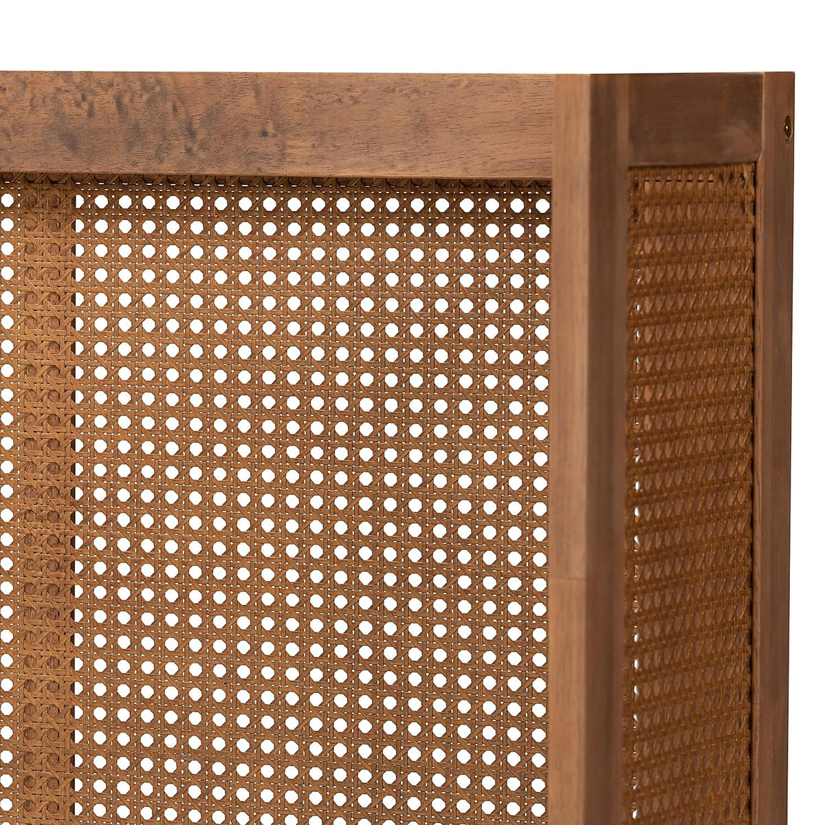 Cultivate a vintage chic vibe in your bedroom with the Rina headboard. This wood headboard displays a classic walnut brown finish that adds warmth to any space. Exquisitely woven synthetic rattan is embedded within the wood to give the Rina an airy, mid-century look. Its wrap-around design provides a cozy feel as you read and watch TV. The Rina headboard is made in Malaysia and requires assembly.