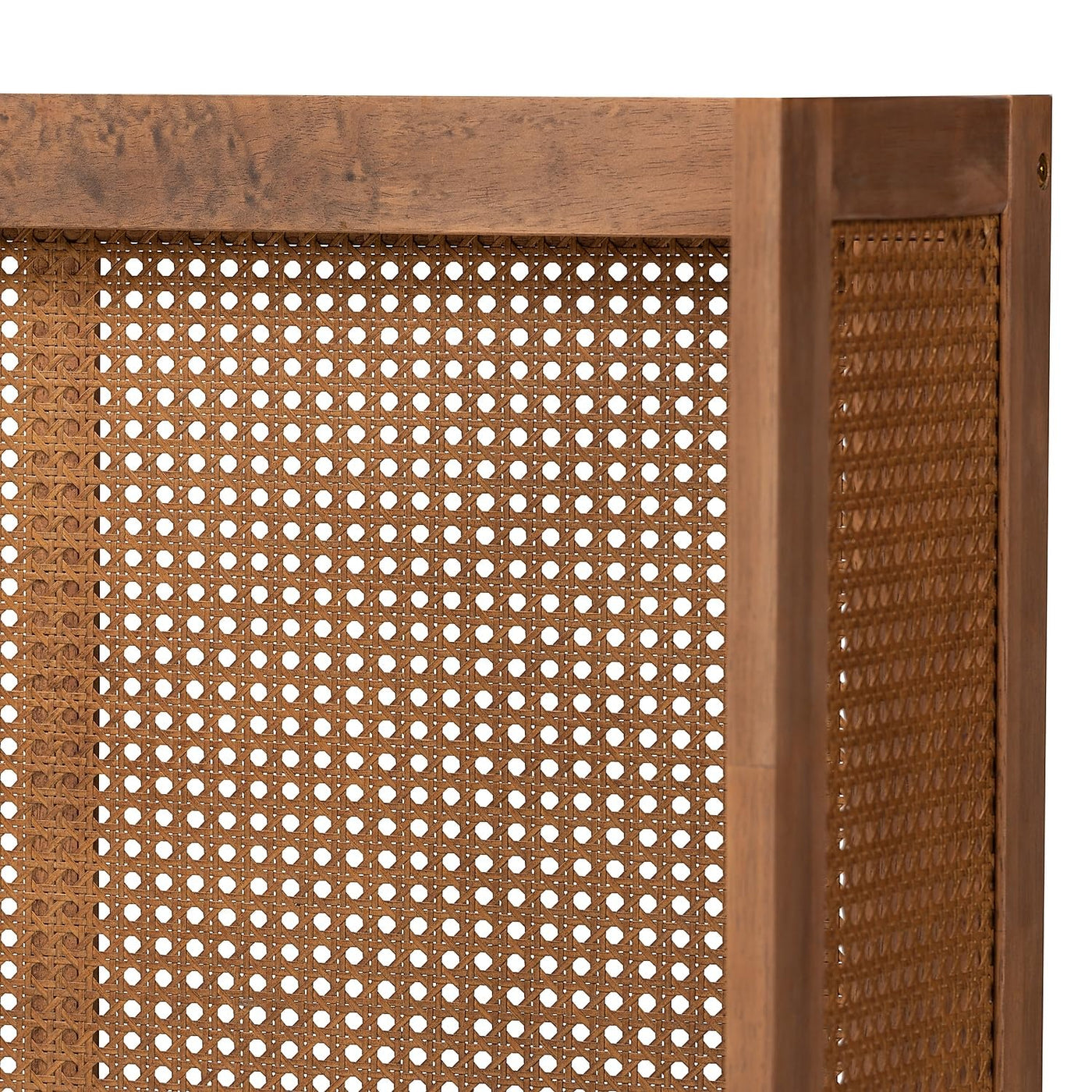 - Mid-century modern headboard. - Constructed from synthetic rattan and solid rubberwood with MDF ash veneer. - Ash walnut finish. - Woven detailing. - Fixed, non-adjustable height. - Assembly required. - Made in Malaysia. - Dimensions: 30.12" High x 79.53" Wide x 9.84" Deep; Headboard Dimensions: 22.4" High x 79.53" Wide x 9.84" Thick; Legs: 7.68" High.