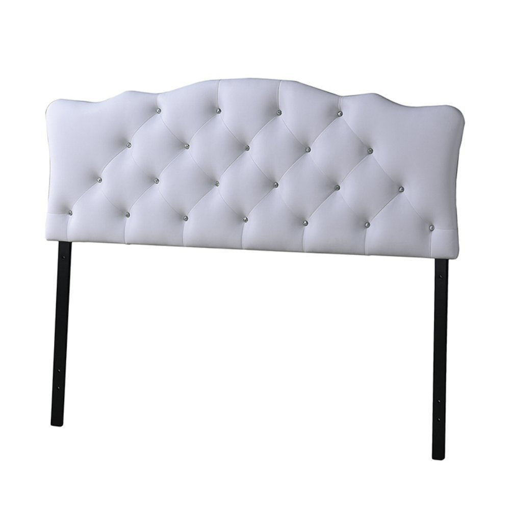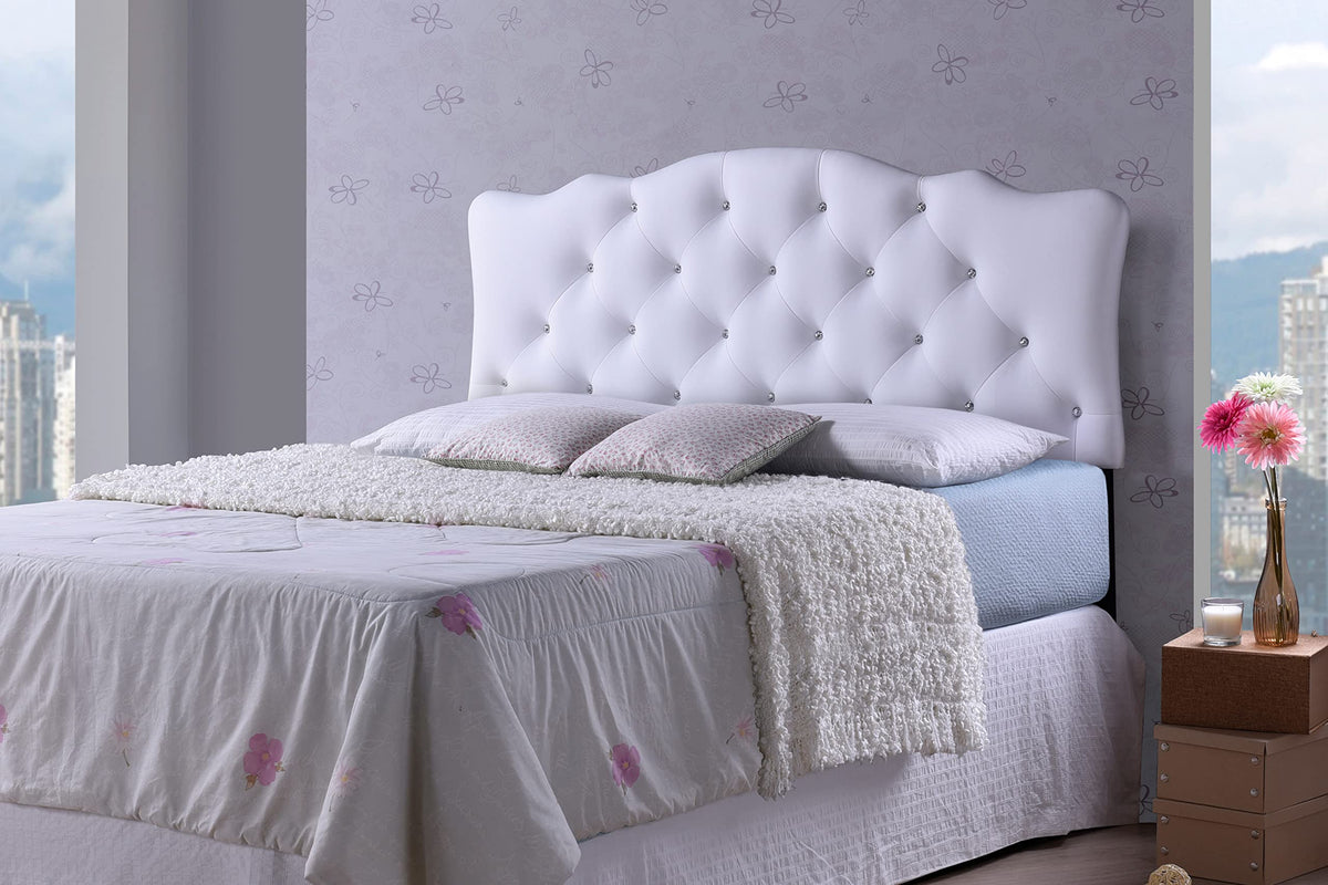 Make a statement with the decorative look and quality finishes of the Rita Upholstered Headboard. Impart a unique elegance into your bedroom interior with this classic piece of design, its scalloped top adding a hint of whimsical charm. The Rita is constructed of quality hardwood frame and is cushioned with high density foam for softness and shape. For an ultra elegant look, the white faux leather headboard is button tufted with faux crystal buttons. The headboard sits between the wall and the ensemble frame, attaching not to the bed base but to the legs, for stability. The leg supports are invisible once set up and can be adjusted to suit the height of your ensemble for convenience. Made in Malaysia, the headboard requires assembly.