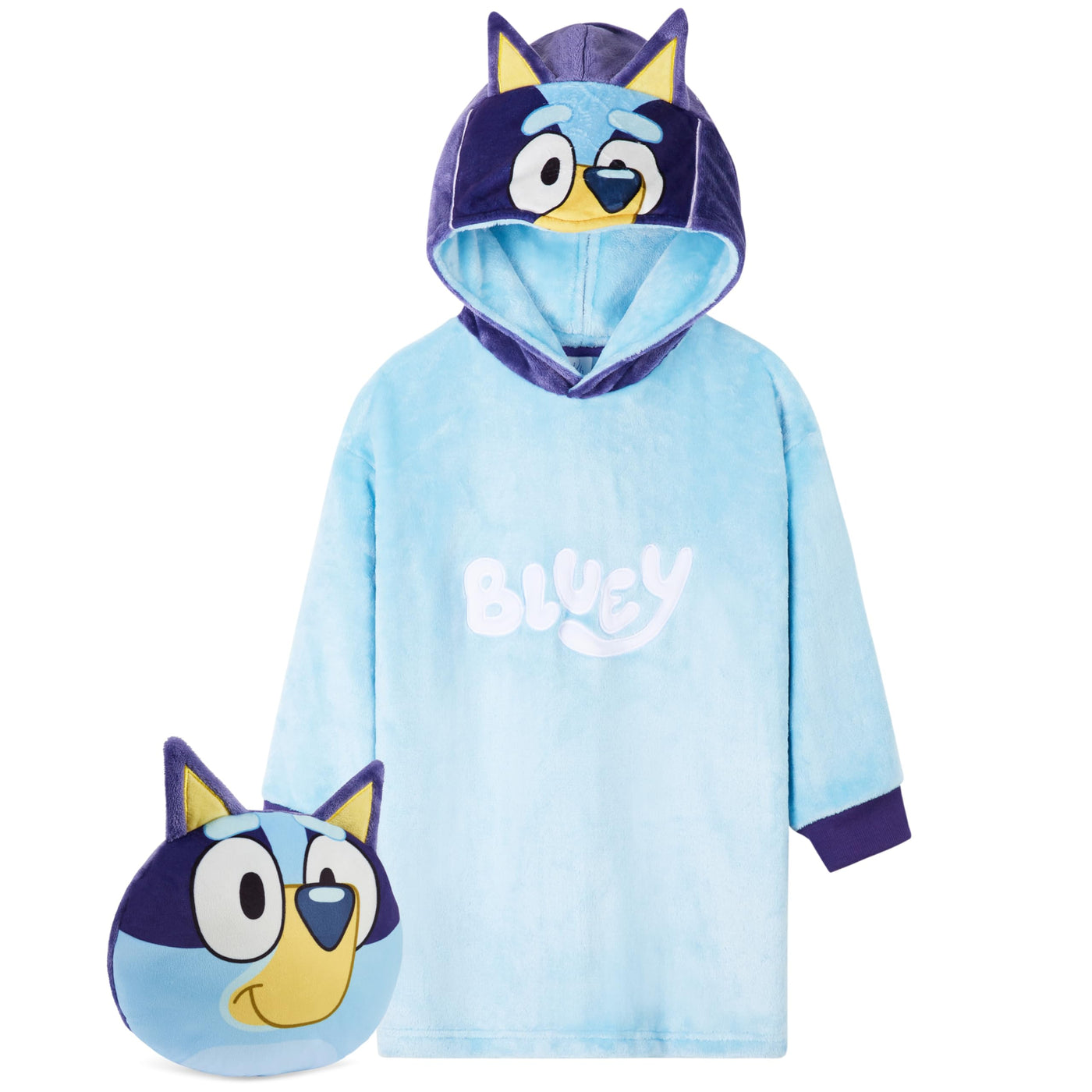 Our Bluey Sweatshirt Blanket Is The Ultimate Cozy Accessory For Young Fans Of The Hit Animated Series! Designed With Both Fun And Function In Mind, This Oversized Poncho-Style Hoodie Is Perfect For Keeping Your Little Ones Warm And Comfortable All Day Long. It Features An Adorable All-Over Bluey Design That Brings Their Favorite Character To Life In A Wearable Form. Made From Ultra-Soft Fleece, It Provides A Gentle And Cozy Touch Against The Skin, Making It Ideal For Chilly Mornings, Movie Nights, Or Just Relaxing Around The House. The Roomy Fit Allows Kids To Move Freely While Staying Snug, And The Sherpa-Lined Hood Adds An Extra Layer Of Warmth For Those Especially Cold Days. Whether Theyre Heading To A Sleepover, Curled Up With A Book, Or Enjoying Some Screen Time, This Wearable Blanket Is Perfect For Any Casual Setting. Easy To Care For And Machine Washable, Its A Practical And Fun Addition To Any Bluey Fans Wardrobe. A Perfect Gift For Birthdays, Holidays, Or Just Because!