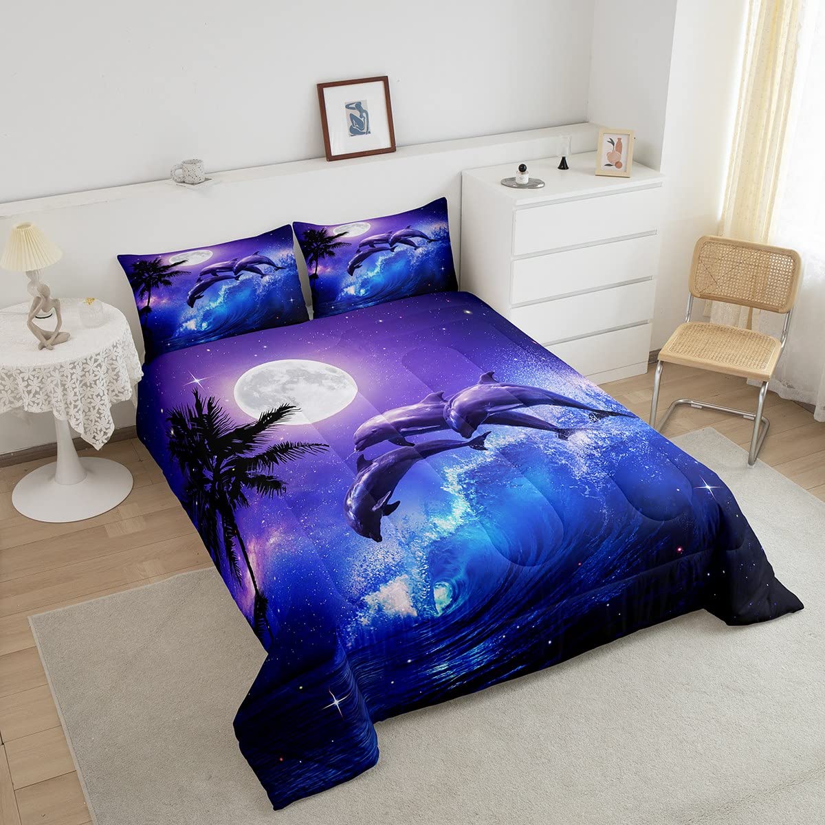 Castle Fairy Dolphin Comforter Set For Boys Girls Kids Teens,3-Pieces Ocean Waves Bedding Comforter Full Size,Moonlight At Night Printed Quilt Set With 2 Pillowcases