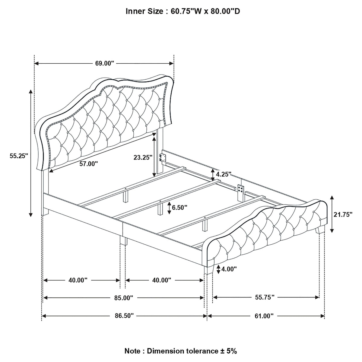 Enhanced with self-welt trim, this bell style headboard adds an ornate and traditional touch to your sleeping space. Button tufting adorns this piece with classic button accents. Intricately applied nailhead trim further enhances the style of this headboard. Upholstered in luxurious grey felt, this is a comfortable and stylish addition to your space. Complete the look of your bedroom with a traditional headboard with modern elements.FeaturesCreate the perfect ambiance by framing your sleeping space Beautifully tailored with button tufted luxurious grey velvet Bell style headboard detailed with hand applied chrome nailheads Self welt trim outlines the front edge profile of both headboard and footboard Constructed with Asian and tropical hardwood, LVL, and MDFDimensions:BedAssembled Product: 69 inches wide x 86.5 inches deep x 55.25 inches high Weight Capacity: 600 poundsAt Coaster, we are your premier source for exquisite furniture, offering diverse styles to enhance every aspect of your life. Our passion for excellence drives us to innovate, crafting budget-friendly furniture that complements your lifestyle. Explore our brands for endless design inspiration and make your living experience exceptional with thoughtfully designed, affordable pieces that inspire a life well-lived.