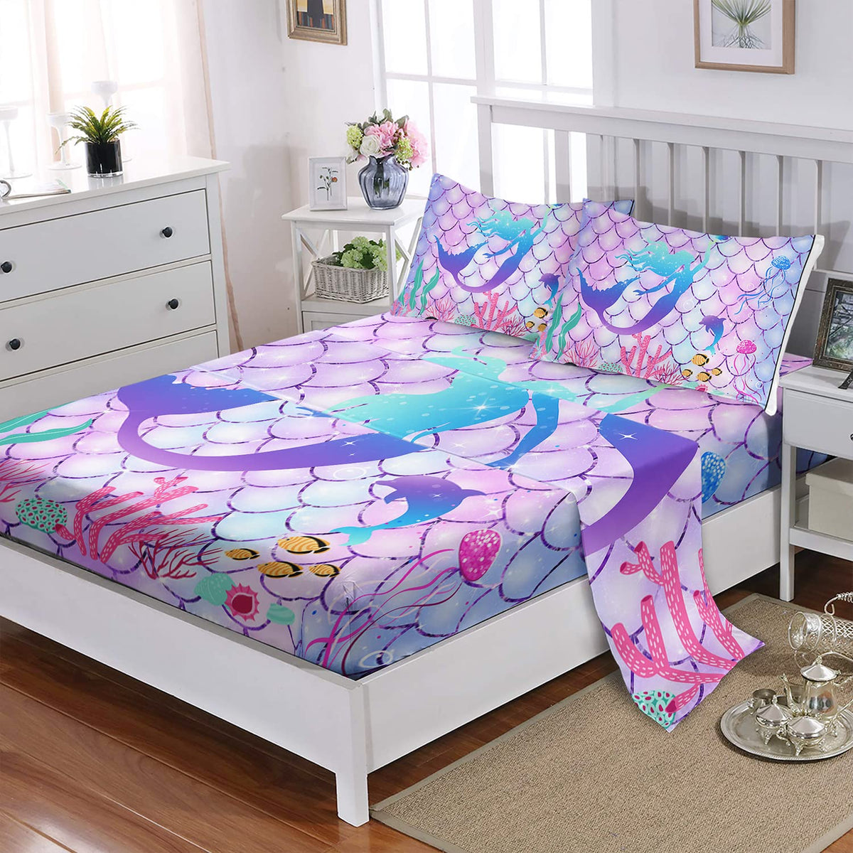 Cvhouse Mermaid Bed Sheets Sets Twin Size,Rainbow Mermaid Bedding Sets For Kids Teens,Ocean Mermaid Fitted Sheet Sets,1 Flat She