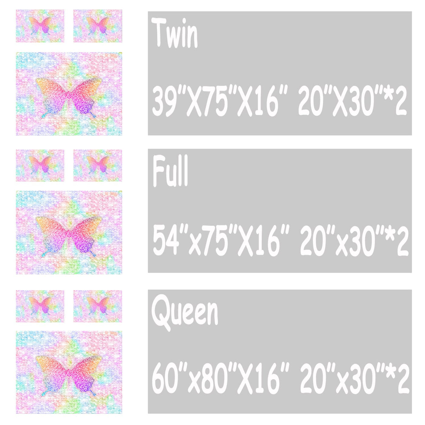 Q: What size bed does the CVHouse Rainbow Butterfly Bed Sheets Set fit?A: The CVHouse Rainbow Butterfly Bed Sheets Set is available in multiple sizes including Twin, Full, and Queen. The Full size includes 1 fitted sheet measuring 54*75*16 inches, 1 flat sheet measuring 96*81 inches, and 2 pillowcases measuring 20x30 inches.