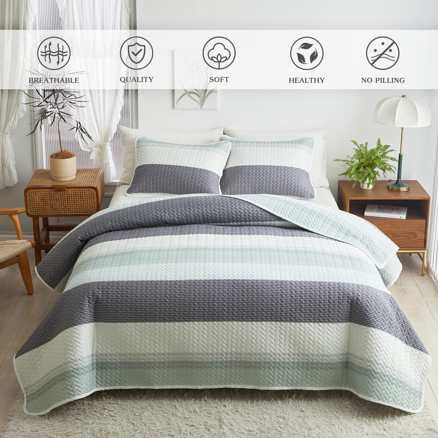 Q: Can I use the Flysheep quilt set in a guest room or vacation room?A: Absolutely! The elegant gray, green, and white striped design of the Flysheep quilt set makes it a perfect choice for use in living rooms, guest rooms, and vacation homes, adding a modern touch to any decor.