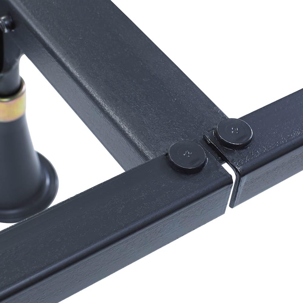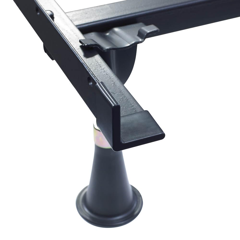 This Premium Bed Frame. Twin/Full/Queen/California King/Eastern King 9 Legs. Easy To Assemble. Extremely Compact. Made Of Heavy Duty High Carbon Recycled Railroad Steel. Water-Based, Lead-Free Black Finish. Solid Rivet Construction Ensures Durability And Stability. Secured Locking Mechanism Is Permanently Attached. Recessed Triple-Thick Steel Legs Provide More Toe Room. Heavy-Duty Headboard Brackets. 7.25"H With Glides. 2-Year Warranty.