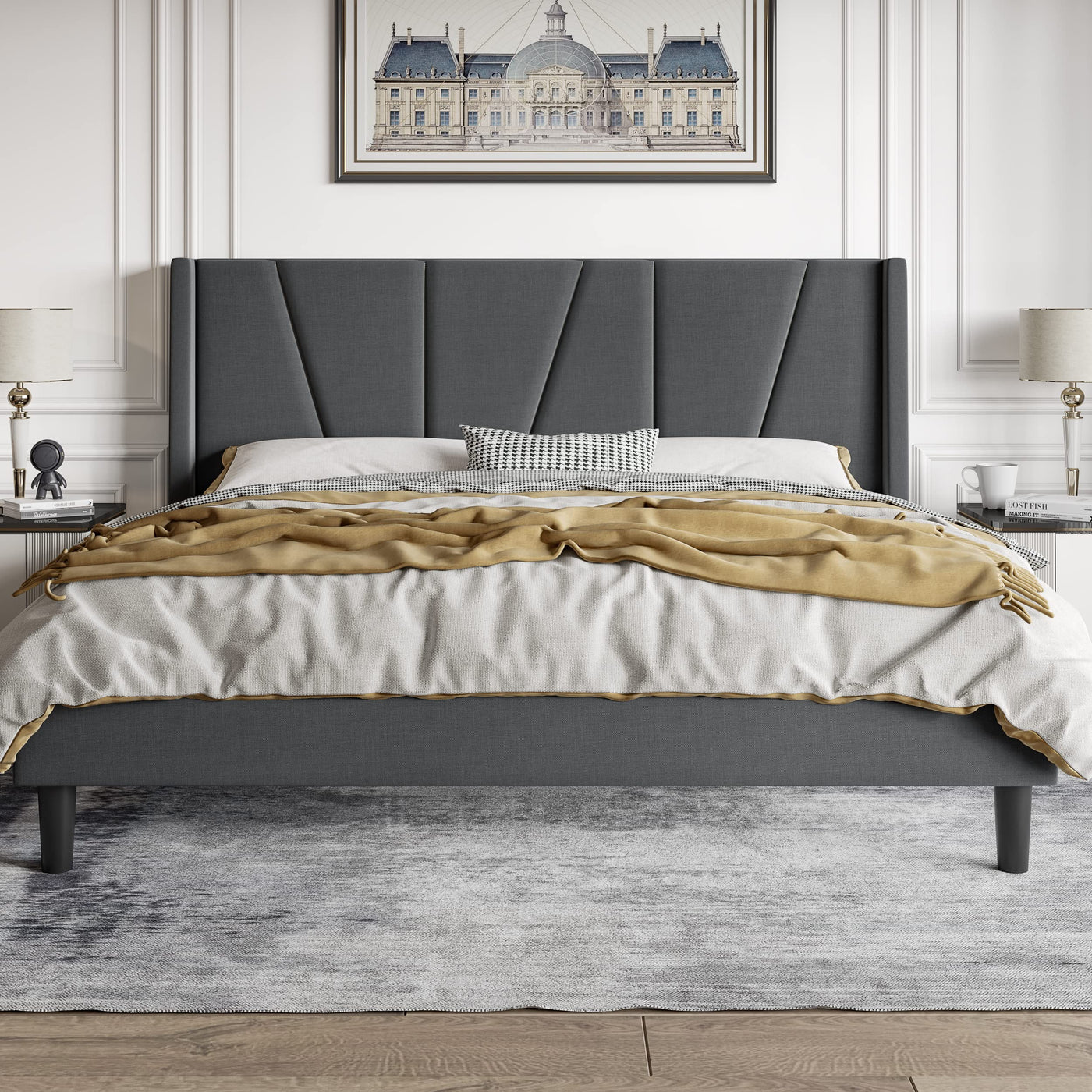 Hoomic King Size Platform Bed Frame With Geometric Wingback Headboard, Wooden Slats Support, No Box Spring Needed, Modern Style In Dark Grey